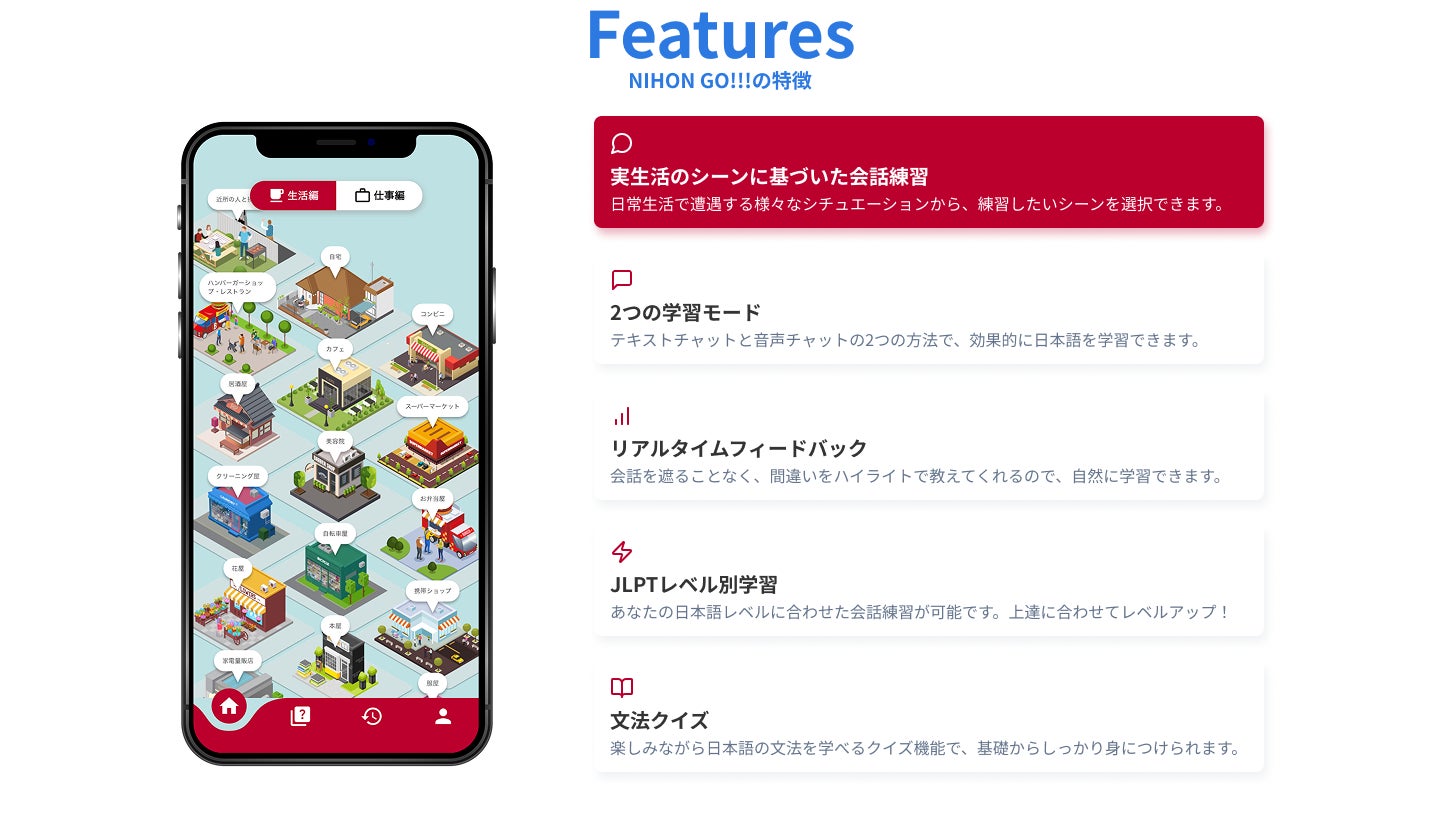 AIとのチャットや音声対話を通じて、買い物・病院・役所などの日常シーンを想定した実践的な日本語を、スマートフォンで楽しく学べます。SAISON JP Life AssistおよびSAISON JP Life Assist for Biz特典の優待をご用意しております。