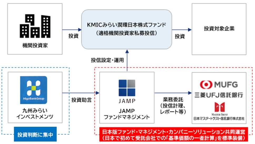 このような問題を克服し、効率的な投資信託委託事業の運営を実現するため、JAMPFMと三菱UFJ信託銀行は日本版FMCをソリューションとして開発し、共同で運用する準備を進めてまいりましたが、その第1号案件として、このたびKMICと連携した適格機関投資家向け私募投資信託「KMICみらい潤環日本株式ファンド」を設定いたしました。