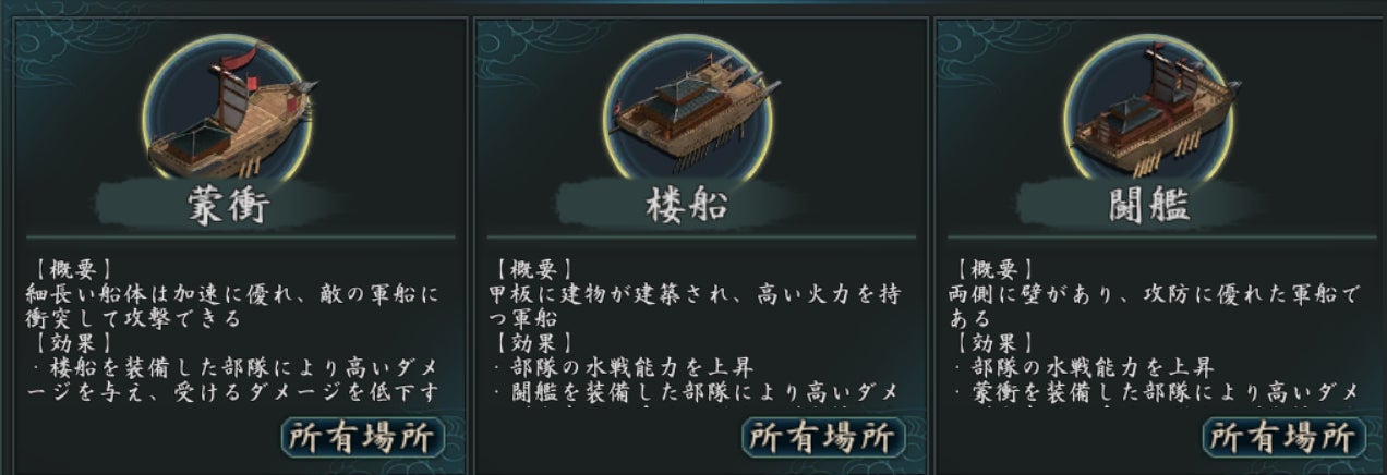 軍船は蒙衝、楼船、闘艦の三種類があり、それぞれ相性が存在します。より巧妙に布陣を設定し、他の君主を圧倒しましょう。