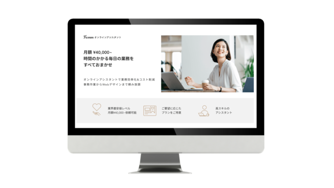 「Fammアシスタントオンライン」は人材不足に課題を抱えているクライアントのノンコア業務から、Webデザイン・デジタルマーケティング、経理・採用・営業などの専門業務まで幅広く対応し、クライアントの従業員の皆さまが本来集中して取り組むべき課題解決フォーカスできるような環境づくりに向けてサービス提供を行っています。また、インサイドセールスや採用、経理などの業務に関し専任チームを作って対応するオンラインBPOサービスも開始しており、より企業のニーズにあったサービスの提供が可能となっております。