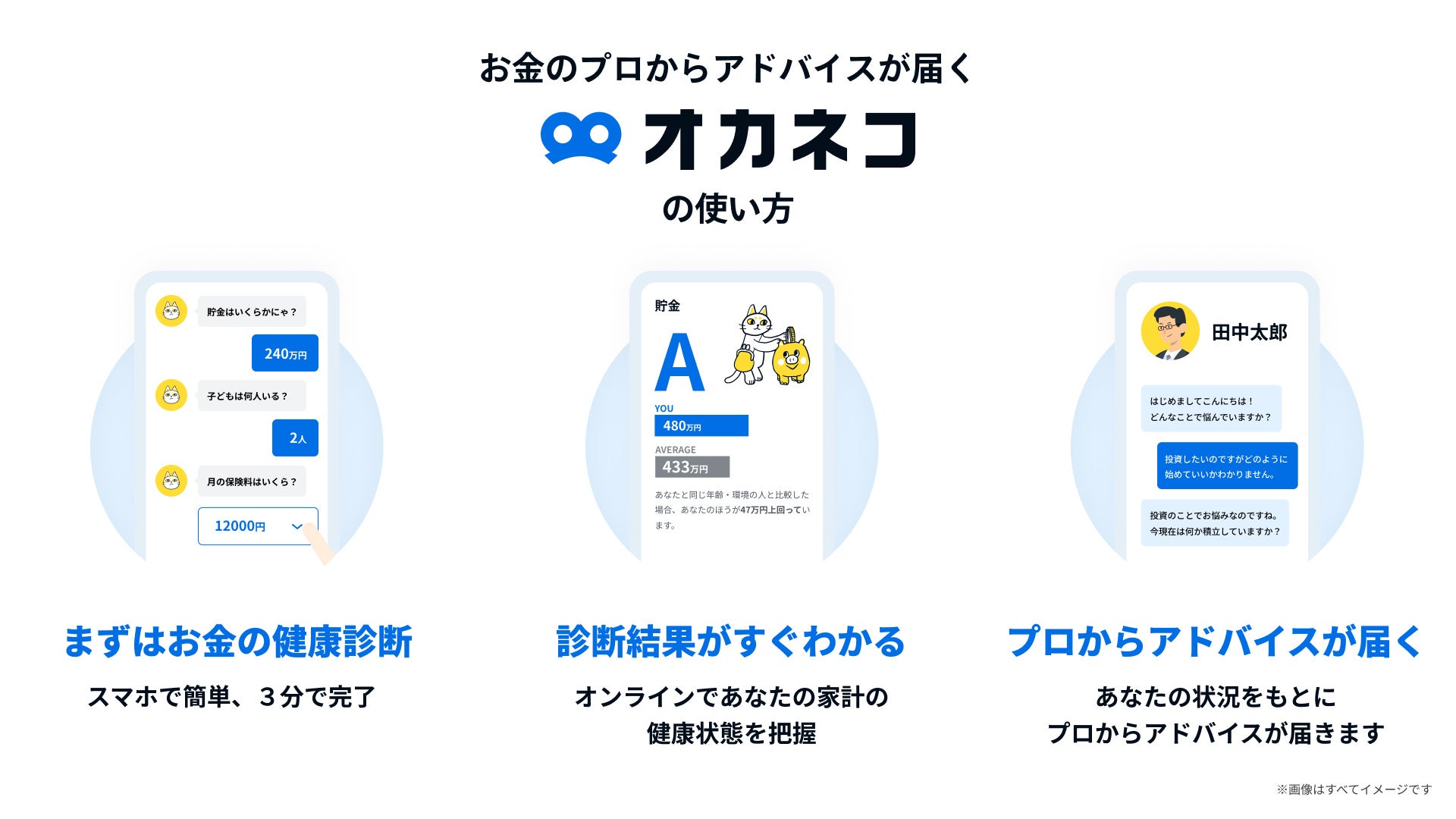 スマホから居住地や年齢、年収、家族構成などの質問に答えるだけで、同地域・同年代の人と比較し、ユーザーの家計状況を診断。その後、診断結果をもとにFP(ファイナンシャルプランナー)やIFA(金融仲介業者)等のお金に関する専門家からアドバイスコメントが届き、ユーザーはチャットで気軽に相談することができるオンラインサービスです。
