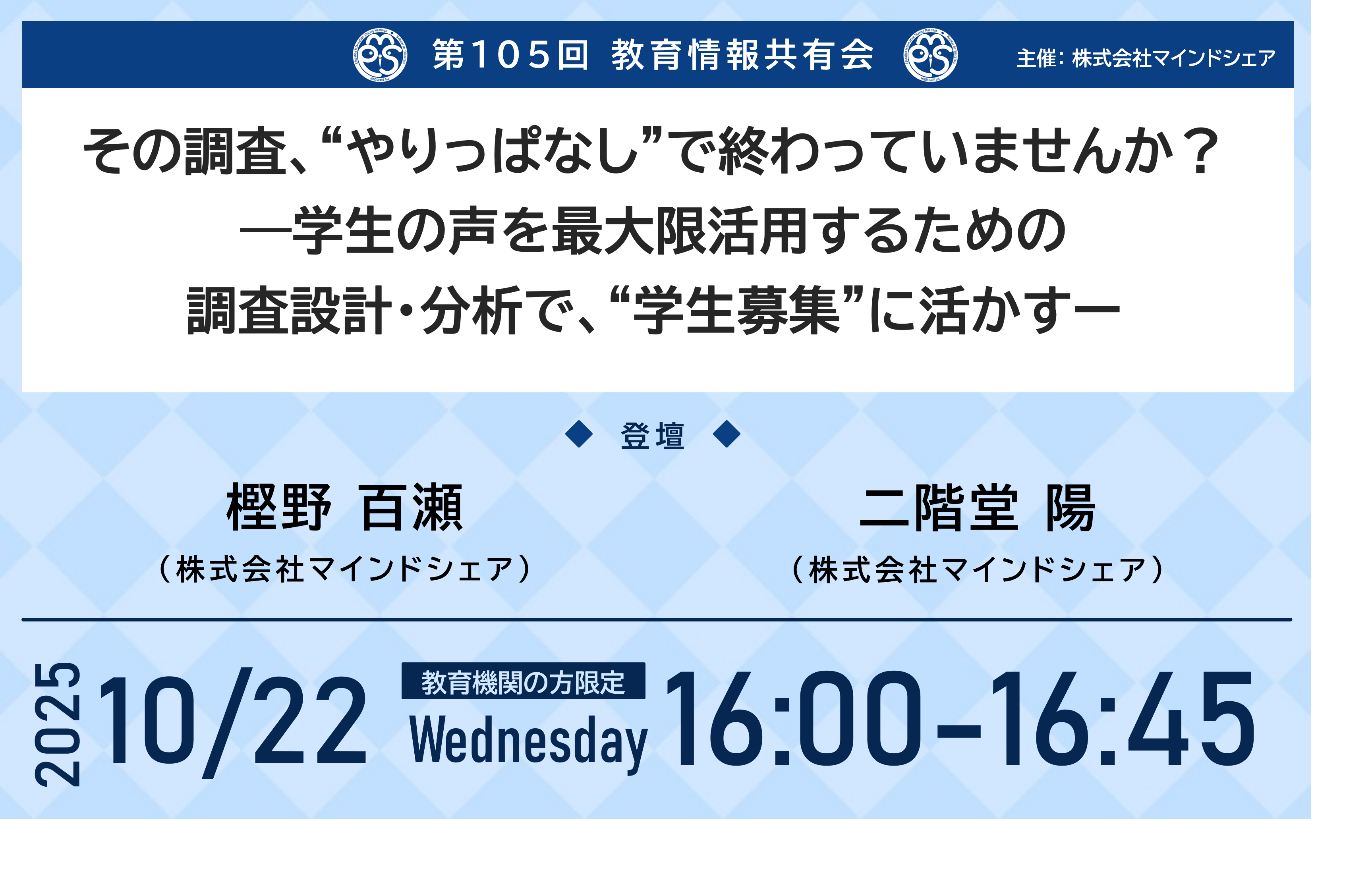第105回となる今回は「その調査、“やりっぱなし”で終わっていませんか?―学生の声を最大限活用するための調査設計・分析で、“学生募集”に活かすー」 というテーマにて教育機関の方限定で実施いたします。