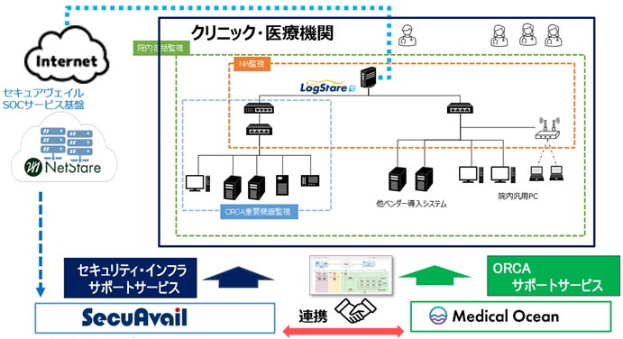 そこでセキュアヴェイルは、医院・クリニック向けに医療ICTサービスを提供するメディカルオーシャンと提携し、セキュアヴェイルが昨年より提供している病院向けセキュリティサービス「NetStare for Medical」を、クリニックのレセプト・電子カルテなどの業務システム、ネットワーク環境、クラウド活用状況に適したサービスとなるよう見直し「NetStare for Clinic」として販売することとしました。