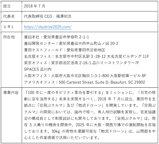 事業内容:「100年に一度のモビリティ革命を牽引する」をミッションに、「日常の移動に空を活用する」未来を実現するべく、2018年7月に設立、豊田市を主拠点に「空飛ぶクルマ」及び「物流ドローン」を開発しています。「空飛ぶクルマ」の開発においては、国内で唯一、有人飛行試験を実現し、官民協議会の構成員として制度設計にも関与しております。「空飛ぶクルマ」は、現在3人乗りの機体を開発中、2025年に大阪・関西万博での運航開始を目指しております。30kgの荷物を運搬可能な「物流ドローン」は、山間部を中心とした作業現場で活用いただいています。