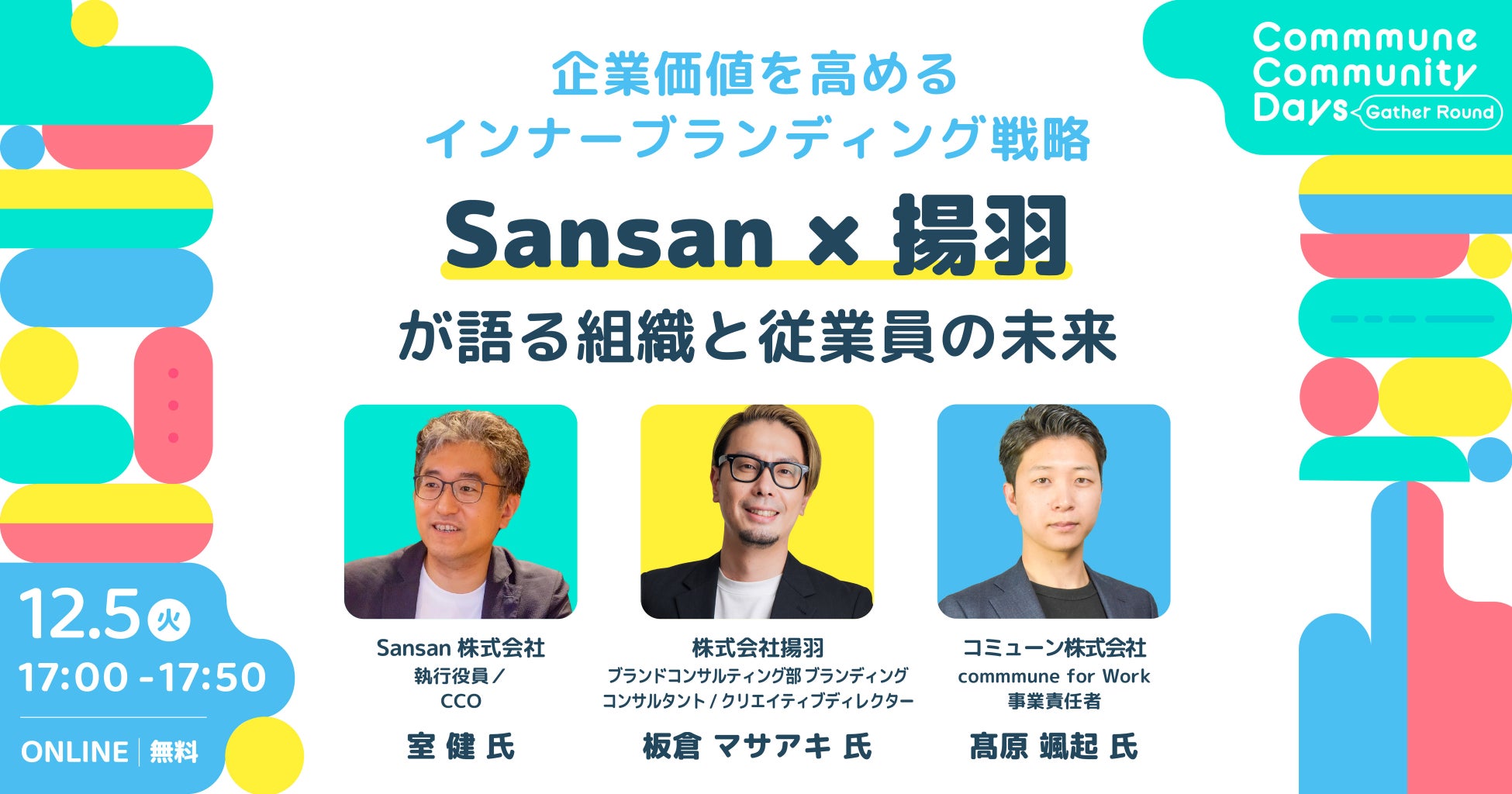 開催日時: 2023年12月5日(火)13:00~18:00 2023年12月6日(水)13:00~17:00 ※「Sansan×揚羽」セッション配信日時:12月5日(火) 17:00-17:50 場所:オンライン(zoomウェビナーによる配信) 主催:コミューン株式会社 参加費:無料 参加登録:https://www.commmune-conference.com/ ※リンク先はコミューン株式会社の運営するWebページとなります。 |