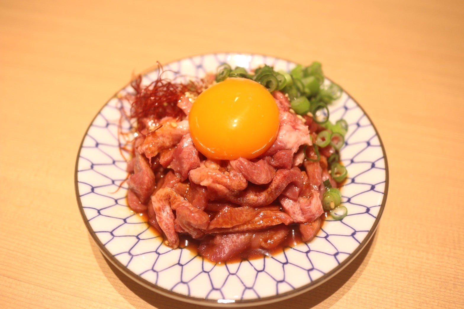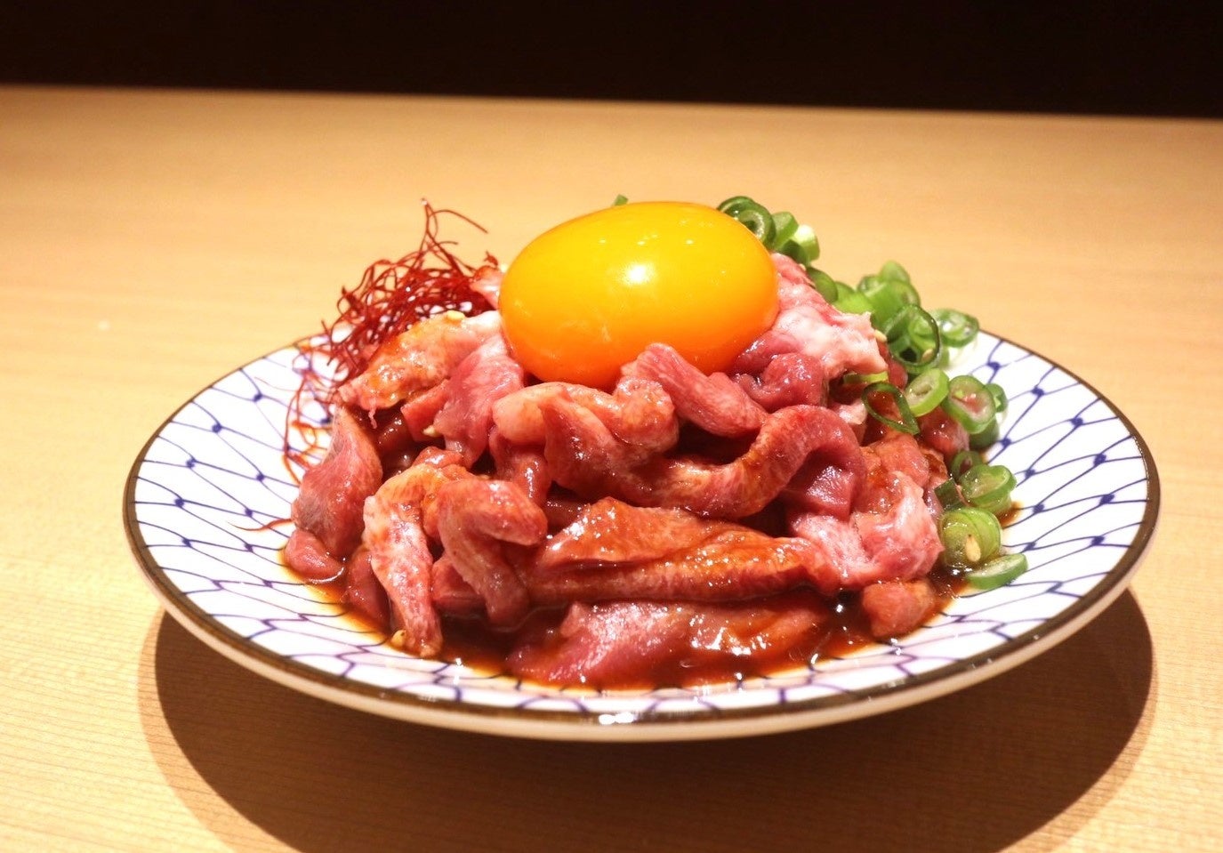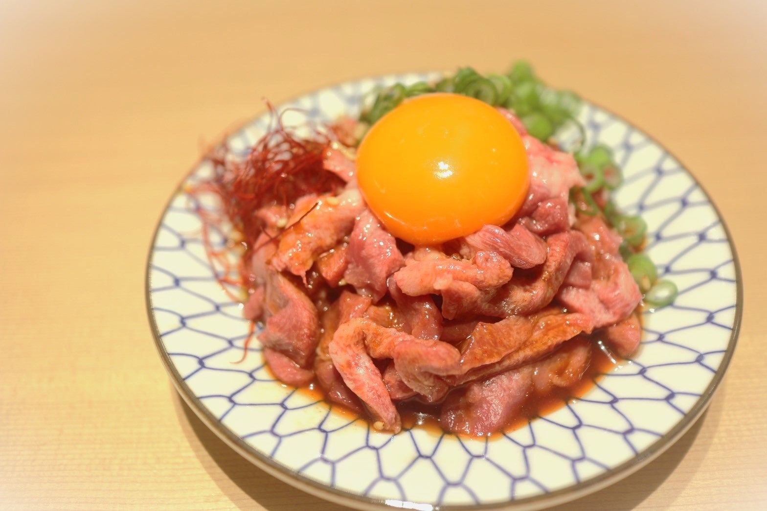 こりこりとした新鮮なタンの触感がダイレクトに楽しめるユッケ、卵黄とピリ辛のたれで絡めて食べる、お酒に合うおすすめの一品。