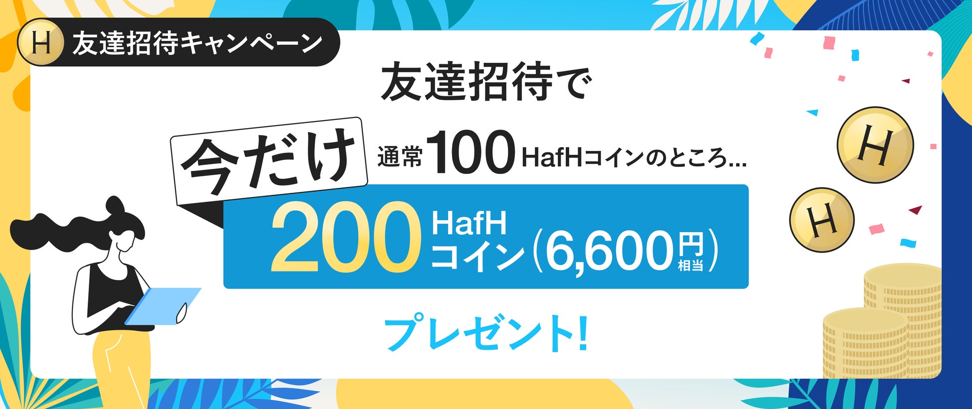 (*2) 2023年7月12日10:00から8月25日18:00の間に、招待用URL経由でHafHの新規会員登録した場合が対象です。招待された方には200コインが付与されます。金額は「コイン購入」のコイン価格に基づき算出しております。