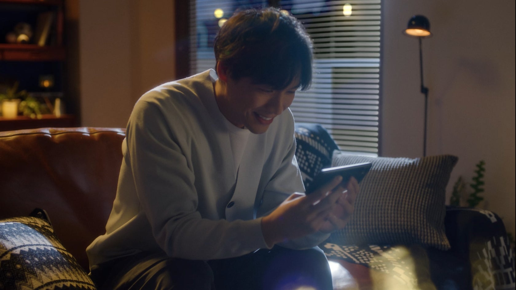 グレーのカーディガンにゆったりとした黒のワイドパンツといったリラックスウェアで撮影に臨んだ福士さん。スマートフォンで「TWINKLE RACE」を観戦するシーンの撮影中、監督から「思い切り感情を出してみて!」という指示が入ると、「おおお!」「きたきたきた!」「どうなる!?」と本当にレースを観戦しているかのようなアドリブのセリフを交えた演技で応えます。ゴール直後の演技では「うわ~~!」とソファにのけぞるほどの迫真の演技を披露しましたが、まさかのフレームアウト。