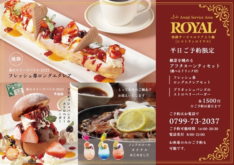 淡路島の玄関口に位置し、明石海峡大橋を眺めながら旬の食材などが味わえるレストラン「ロイヤル」やフードコート、カフェa-too、ラーメン尊(みこと)等専門店を擁する淡路サービスエリア上り線飲食ゾーン(運営受託:ユーアールエー株式会社/所在地:兵庫県淡路市岩屋)。そのレストラン「ロイヤル」では、2月13日(火)より平日ご予約限定メニューの提供を開始いたします。雄大な明石海峡大橋を一望できるレストラン店内で、アフタヌーンティーセットなどをご予約の上お楽しみください。