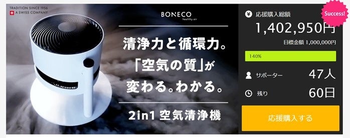 Makuake公開4時間で目標金額達成! “アルプスで暮らすような健康的な空気”を作るスイスの老舗家電メーカー・BONECOより、日本初上陸の2in1空気清浄機がMakuake限定で予約販売中!