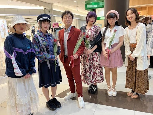 粕屋町では毎年5月に薔薇祭りが実施されているとのことで、そのお祭りで実際に使われる薔薇を特別に市場から仕入れ、出演者の方々に持っていただきました。