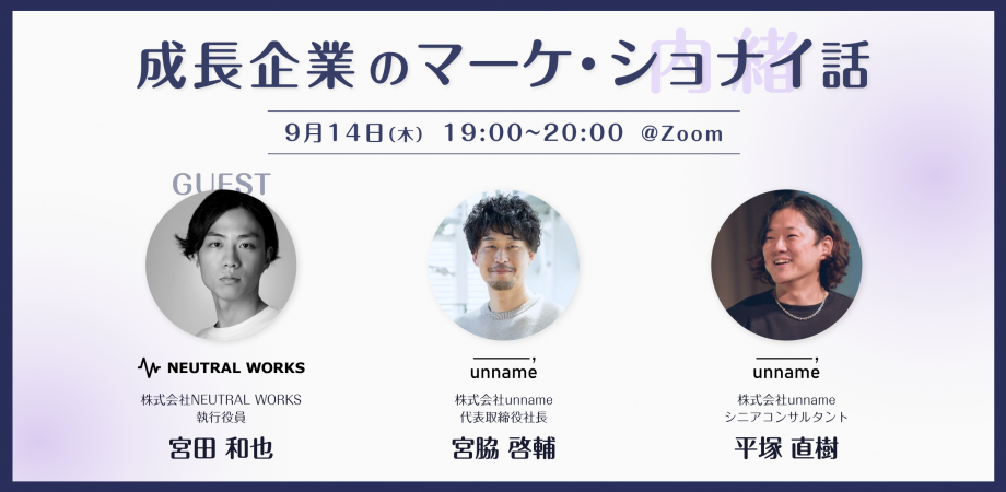 【9/14ウェビナー】「成長企業のマーケ・ショナイ話 ~ここでしか聞けない「ショナイ(内緒)話」を聞きに来ませんか?~」に弊社執行役員 宮田が登壇します