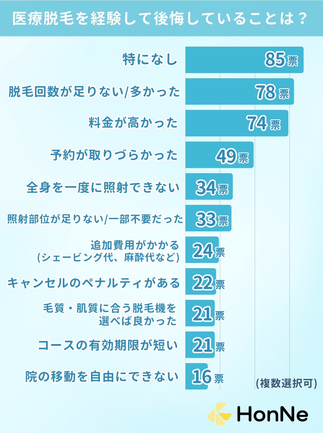 医療脱毛に満足はしているものの、理想の状態になるまでの回数や、他と比べると金額が高かったなどの料金面で後悔している回答が見られました。