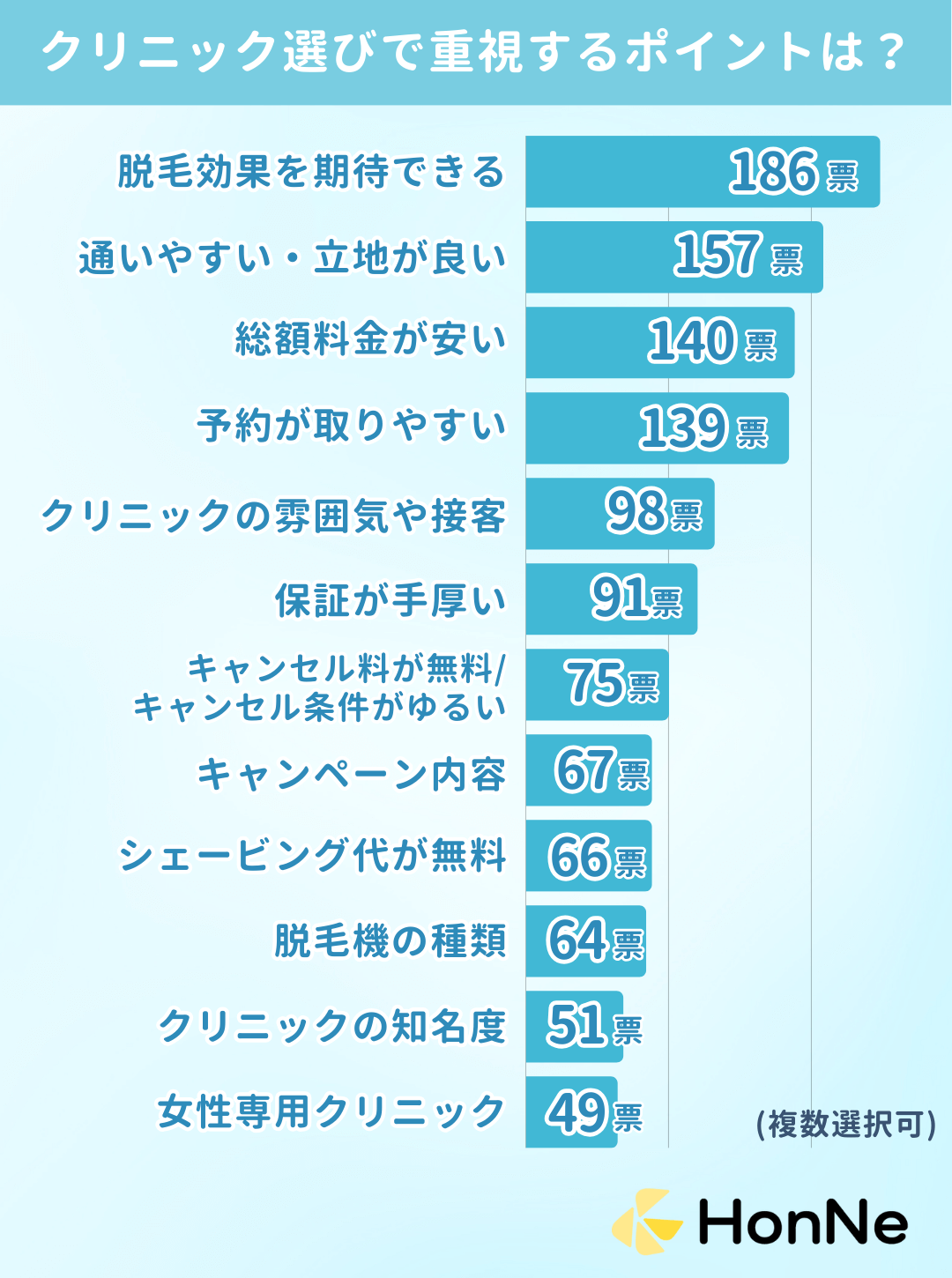 それほど「効果」に期待し、医療脱毛を選択していることが伺えます。また、重視しているポイントとしては以下の結果になりました。(※複数選択可)