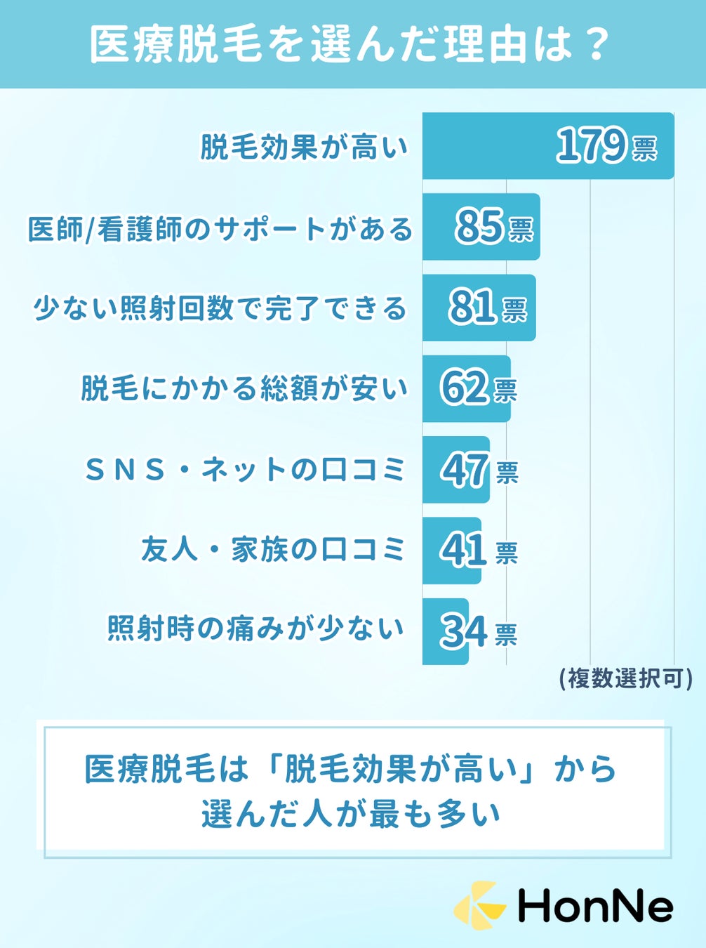 医療脱毛を選択した理由として、「脱毛効果が高い」ことに179票と最多の票数が集まっています。次いで、「医師/看護師のサポートがある」となっており、肌トラブルなどが起きた際に対処できる安全性が選択理由にあげられました。