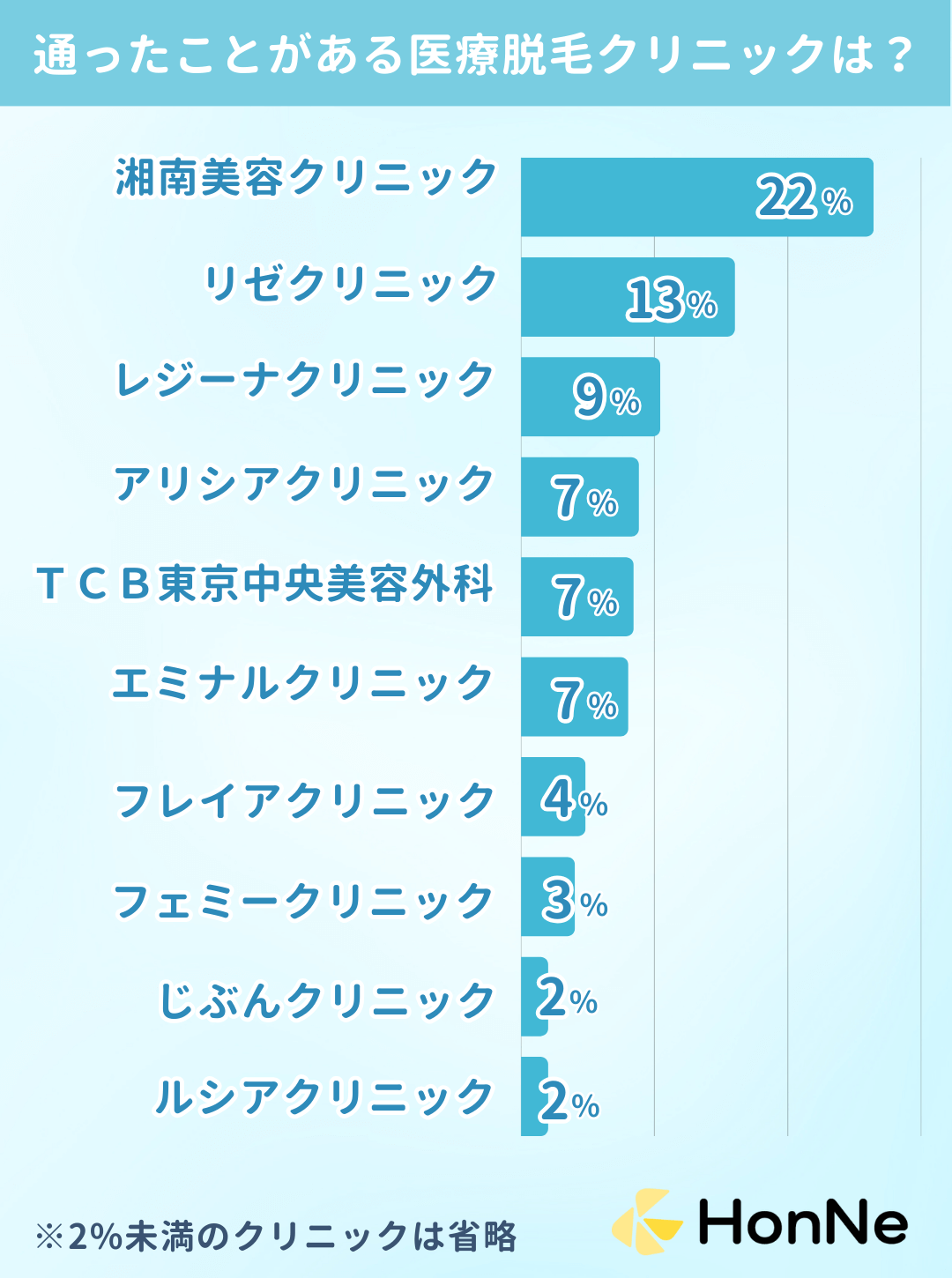 通ったことがある医療脱毛クリニックを調査した結果、「湘南美容クリニック」が最多となりました。湘南美容クリニックはクリニックの数が全国に多いため、利用者が多い結果につながっていると思われます。