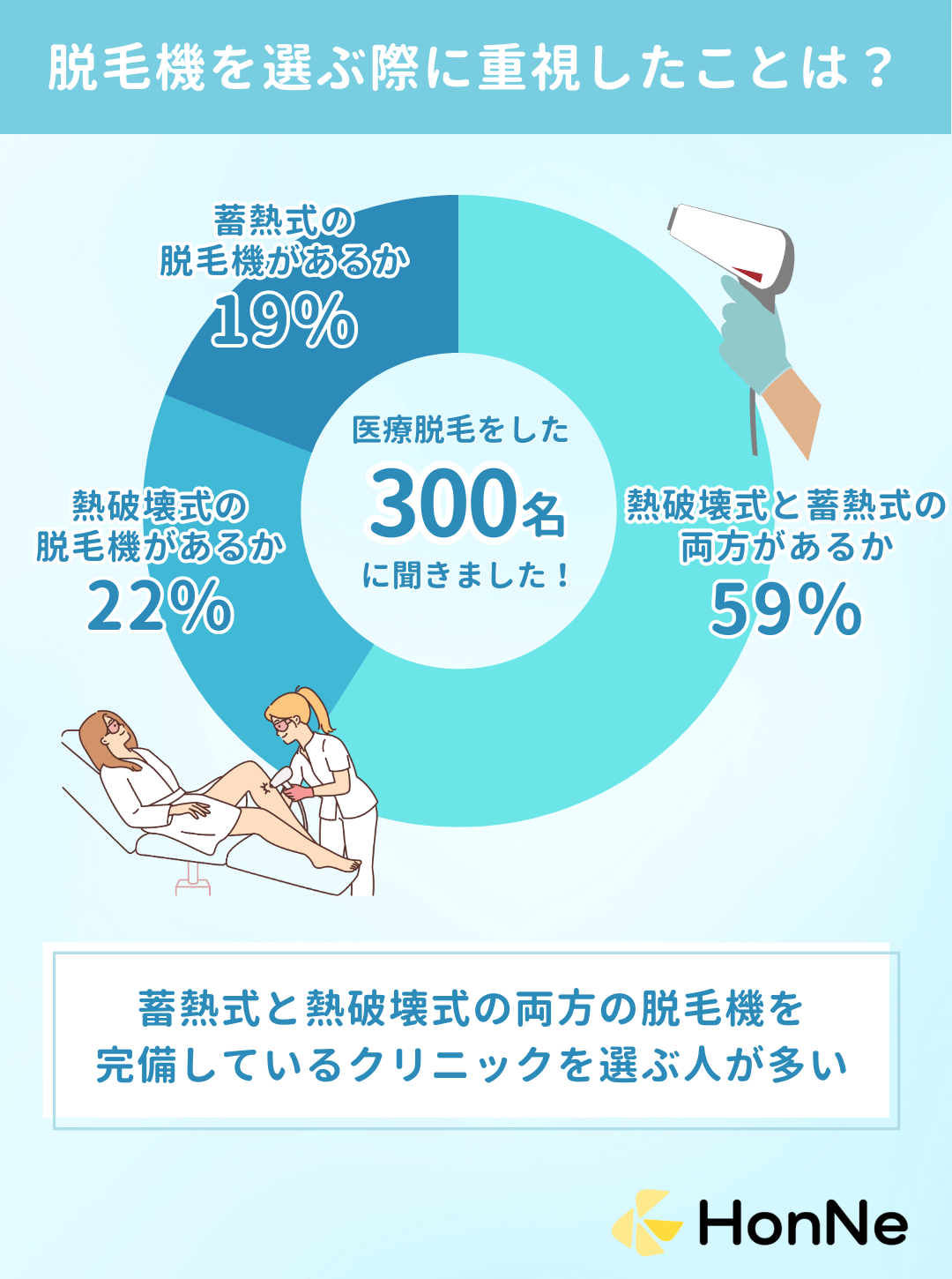 脱毛機は「蓄熱式」「熱破壊式」両方あるクリニックを選ぶ人が59%