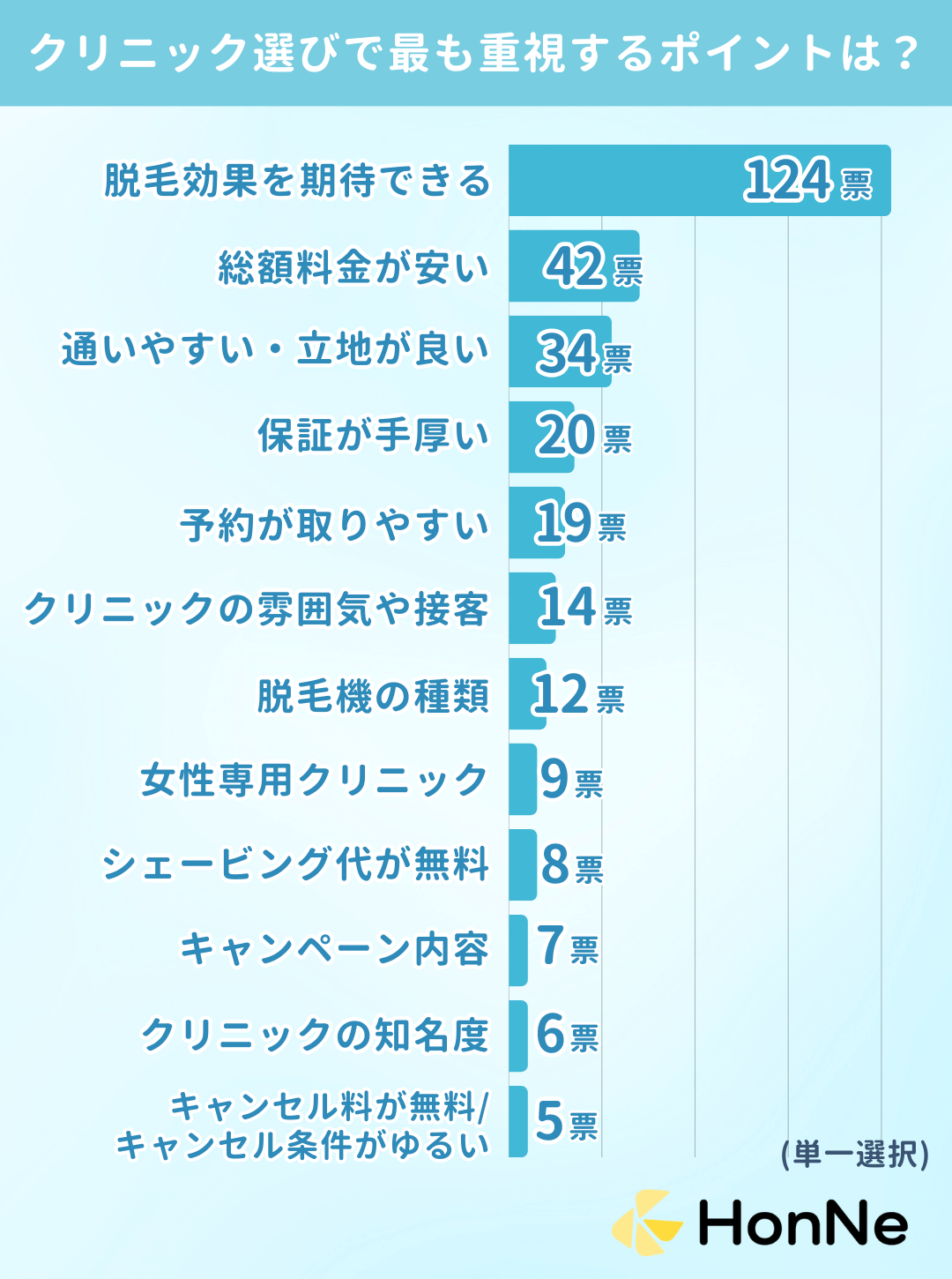 医療脱毛クリニック選びで最も重視するポイントは「脱毛効果を期待できる」を選択する人が最も多く、次の「総額料金が安い」と3倍近く差があります。(※単一選択)