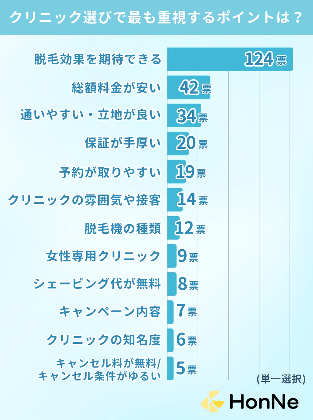 クリニック選びで最も重視するポイントは「脱毛の効果」。効果以外の重視ポイントは?