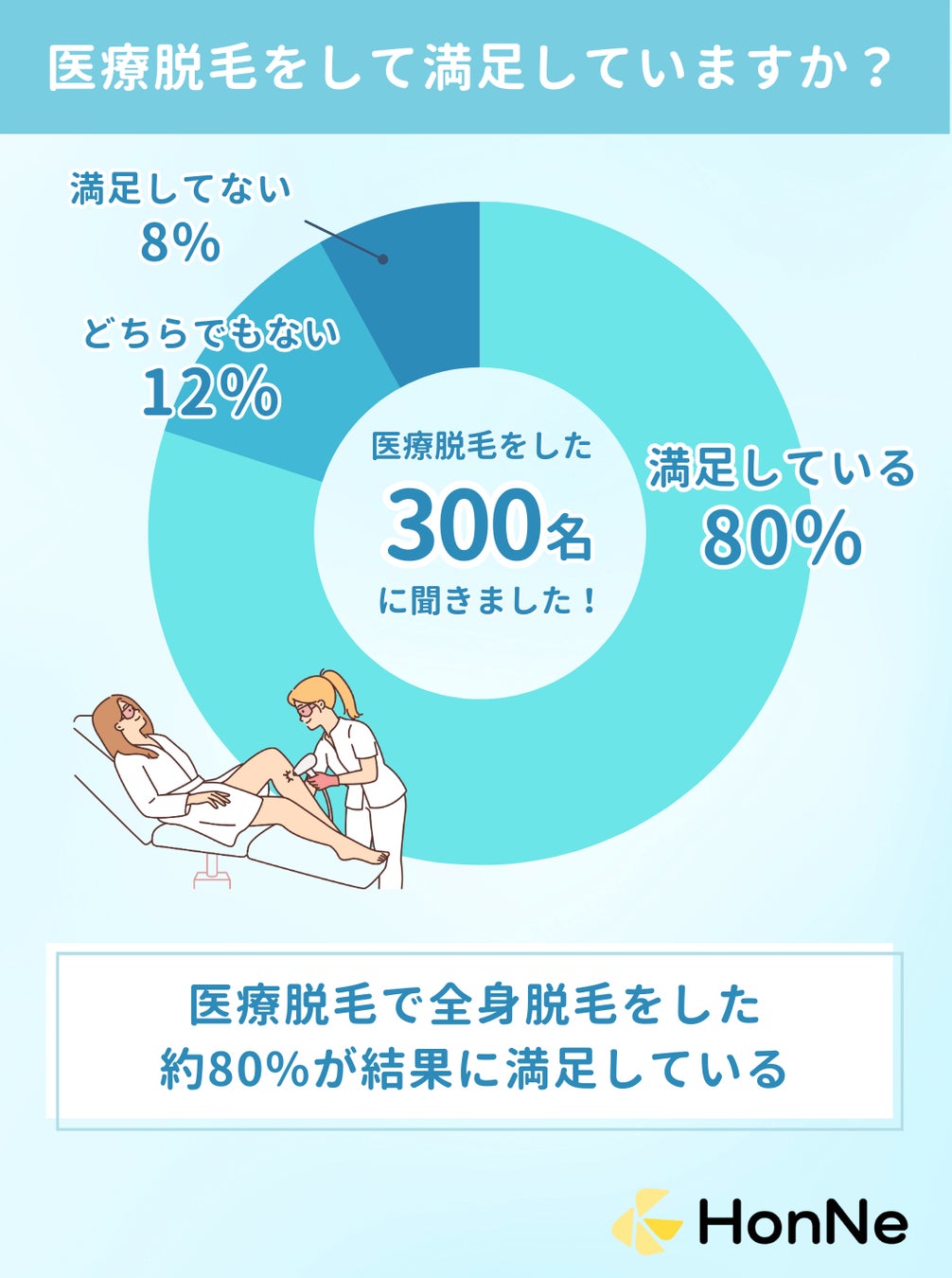 医療脱毛で全身脱毛をした300名のうち、80%の人が結果に満足していることがわかりました。