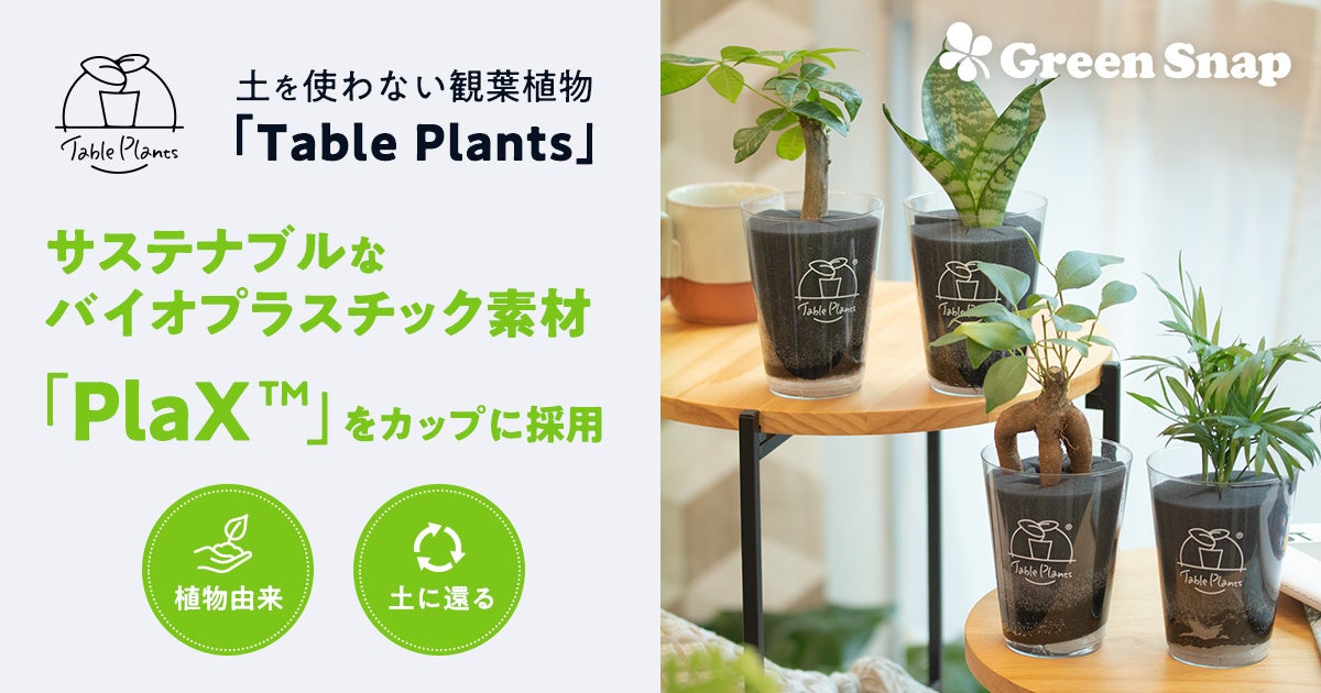 GreenSnap、Table Plantsのカップに植物由来の土に還るサステナブルなバイオプラスチック素材「PlaX™️」を採用