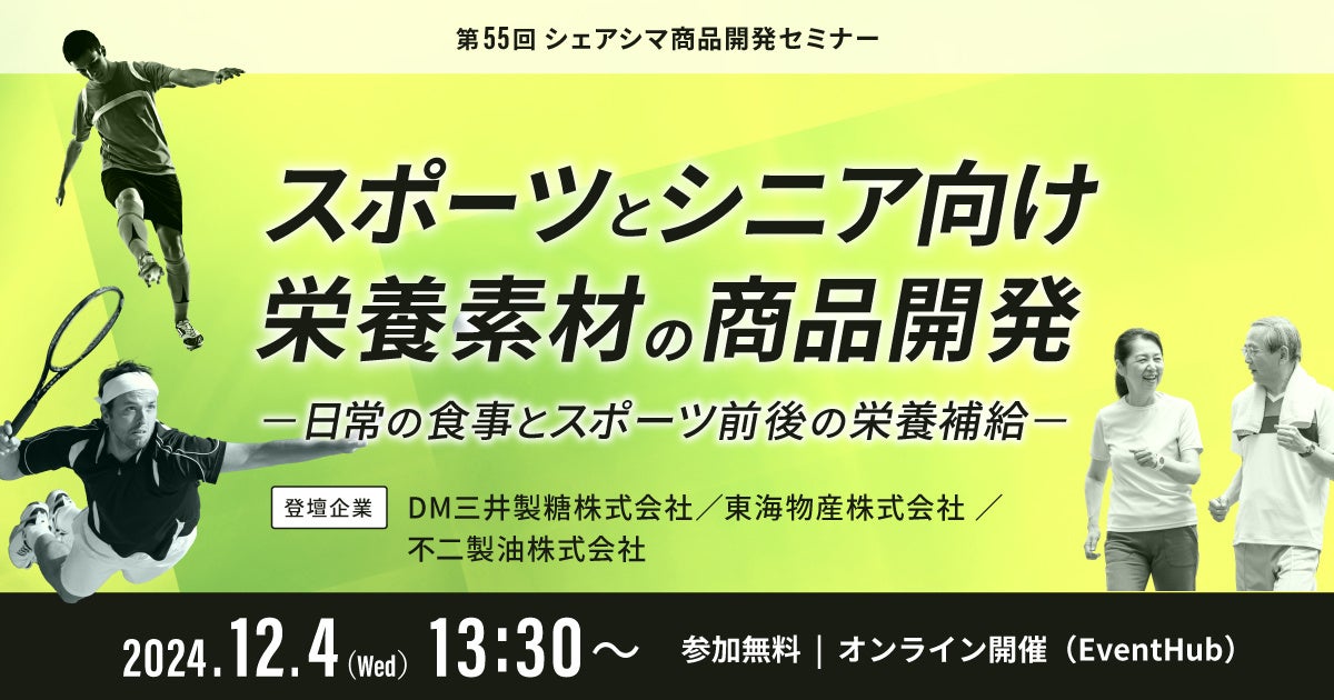 《シェアシマ商品開発セミナー》スポーツとシニア向け栄養素材の商品開発~日常の食事とスポーツ前後の栄養補給~12月4日開催