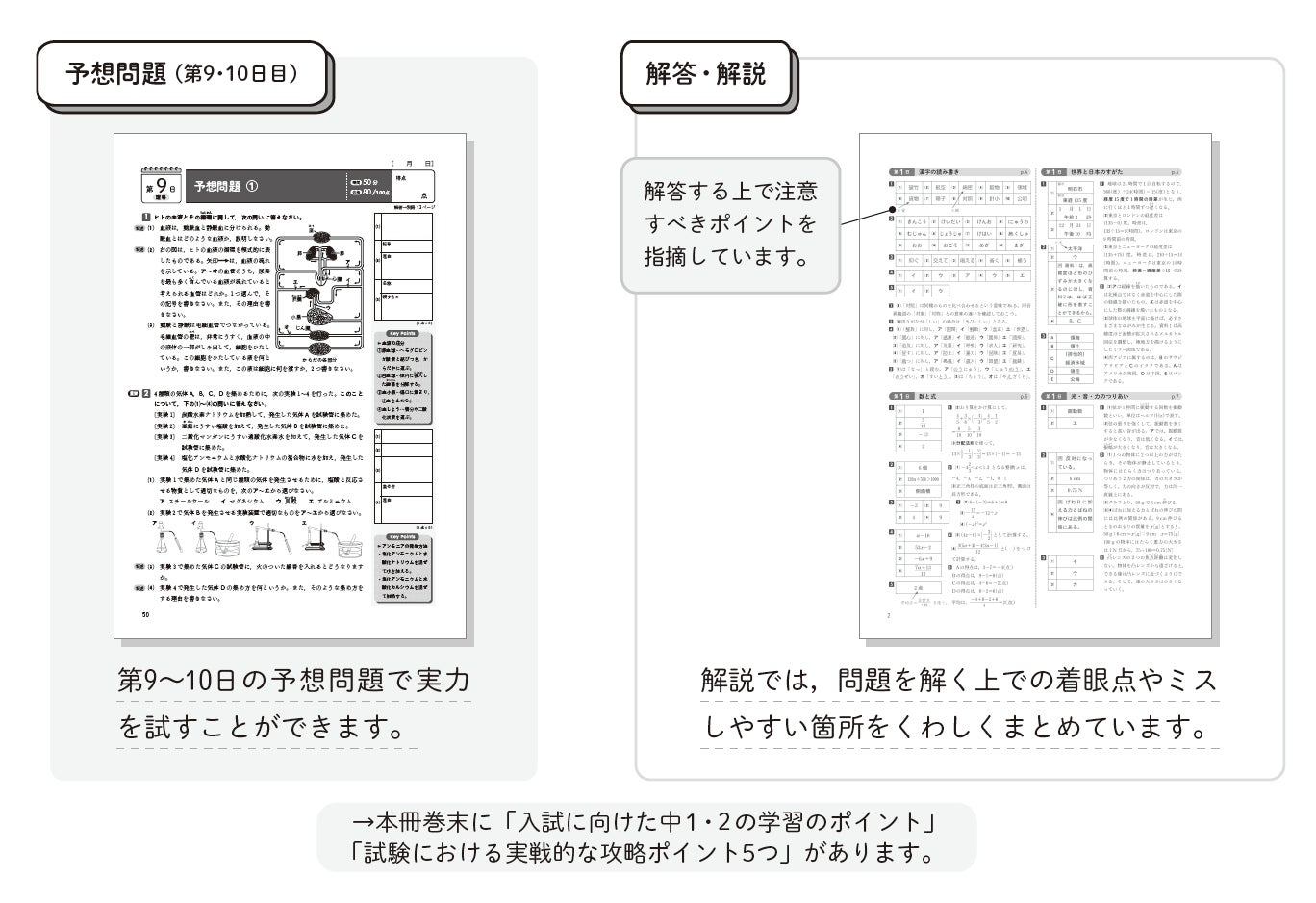 「中1・2の総復習」では、第1日~第8日は基礎力を強化、第9日・第 10 日は中学1・2年の内容を踏まえた予想問題で5科の総復習ができます。解けなかった問題をくり返し復習することで、弱点をなくしていくことにつなげます。