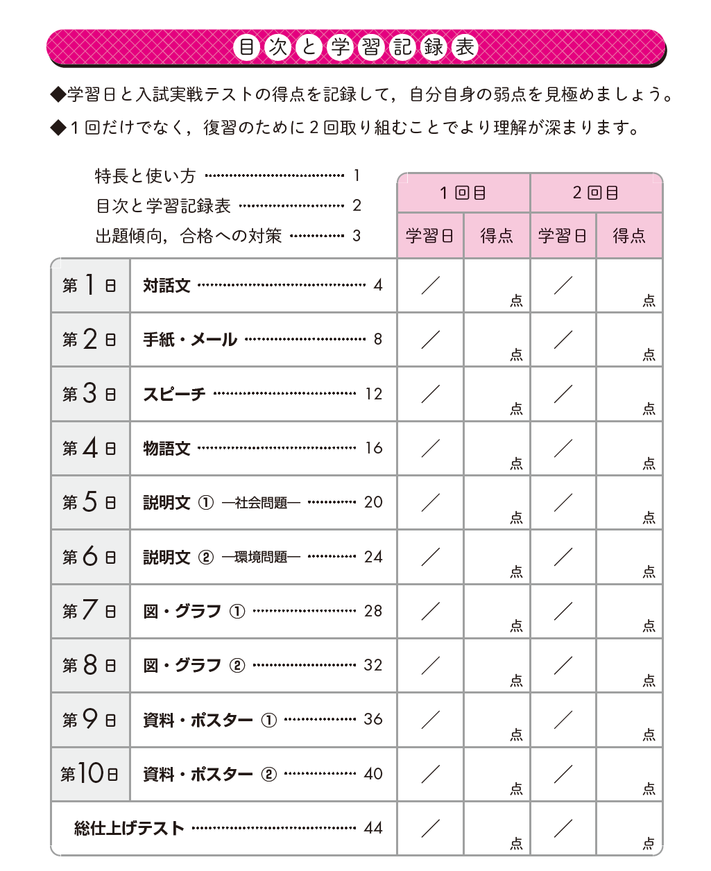 「高校入試」では、第1日~第7日に単元別配列で実力が身についているかを確認。第8日~第 10日に中学3年分の予想問題でまとめて実力を試すことができます。
