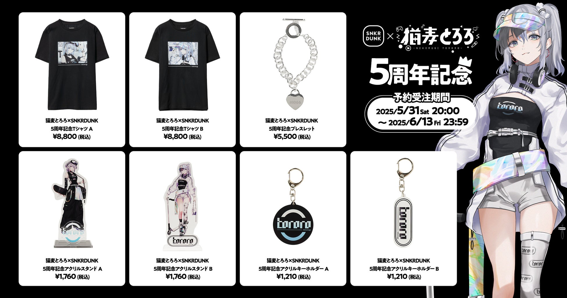 「SNKRDUNK(スニーカーダンク)」(以下、スニダン)を運営する株式会社SODA(本社:東京都渋谷区、代表取締役CEO:内山 雄太、以下SODA)は、2025年5月31日(土)より、大人気VTuber猫麦とろろさんのデビュー5周年を記念し、スニダンと特別コラボレーションしたオリジナルグッズの予約受注販売を開始します。