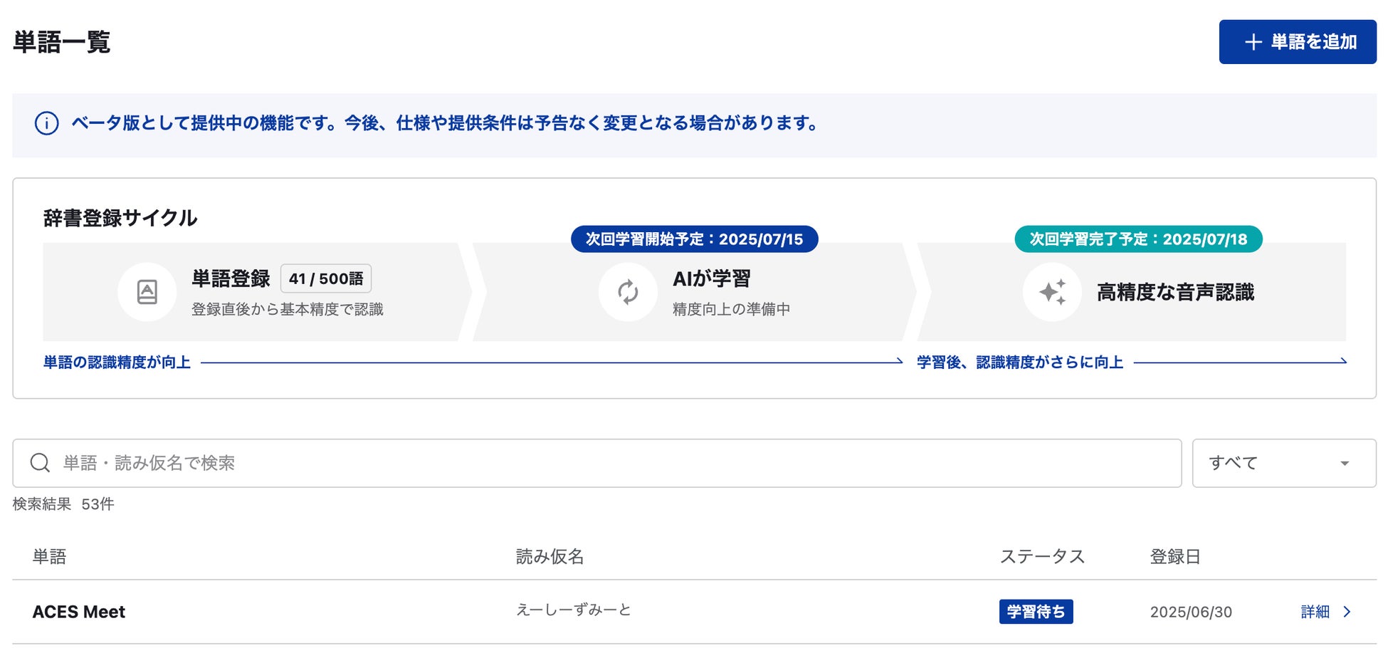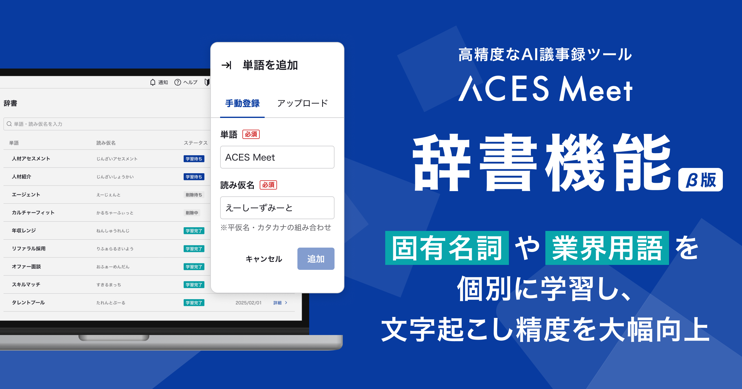 株式会社ACES(東京都文京区、代表取締役 田村 浩一郎、以下「ACES」)は、高精度AI議事録ツール「ACES Meet」において、「辞書機能」(β版)をリリースしました。