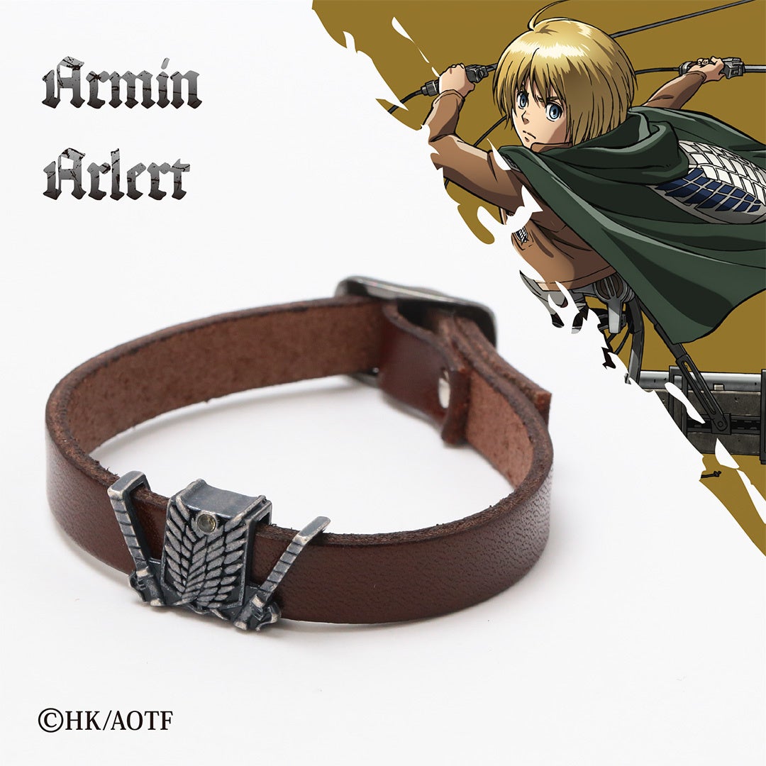ブレス本体は調査兵団が身に着けているベルトを彷彿とさせるようなシンプルなデザインに仕上がりました。アルミンの戦いを身近に感じてください。