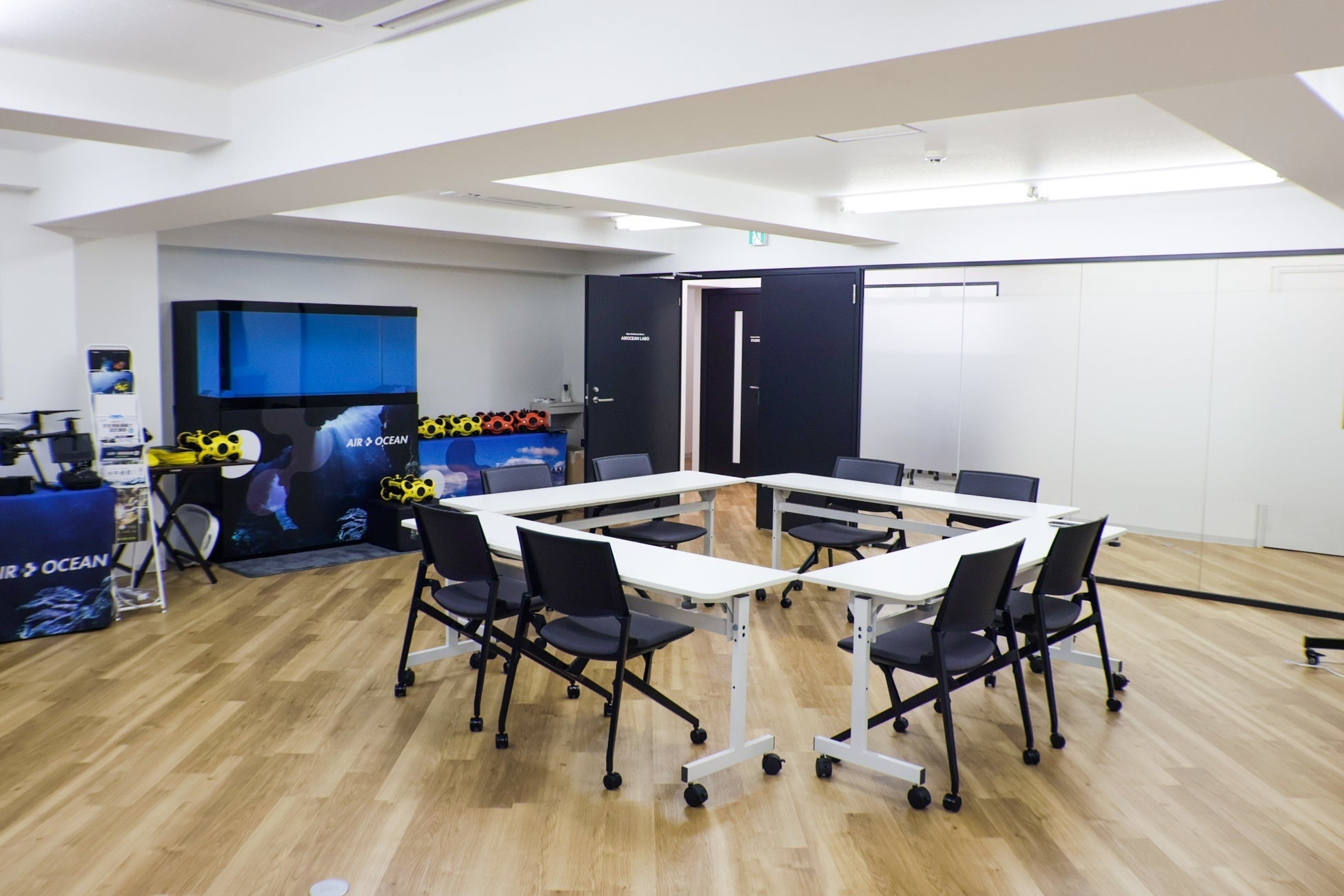 座学会場となるエアオーシャンラボには空中・水中の様々なドローンを展示しております。