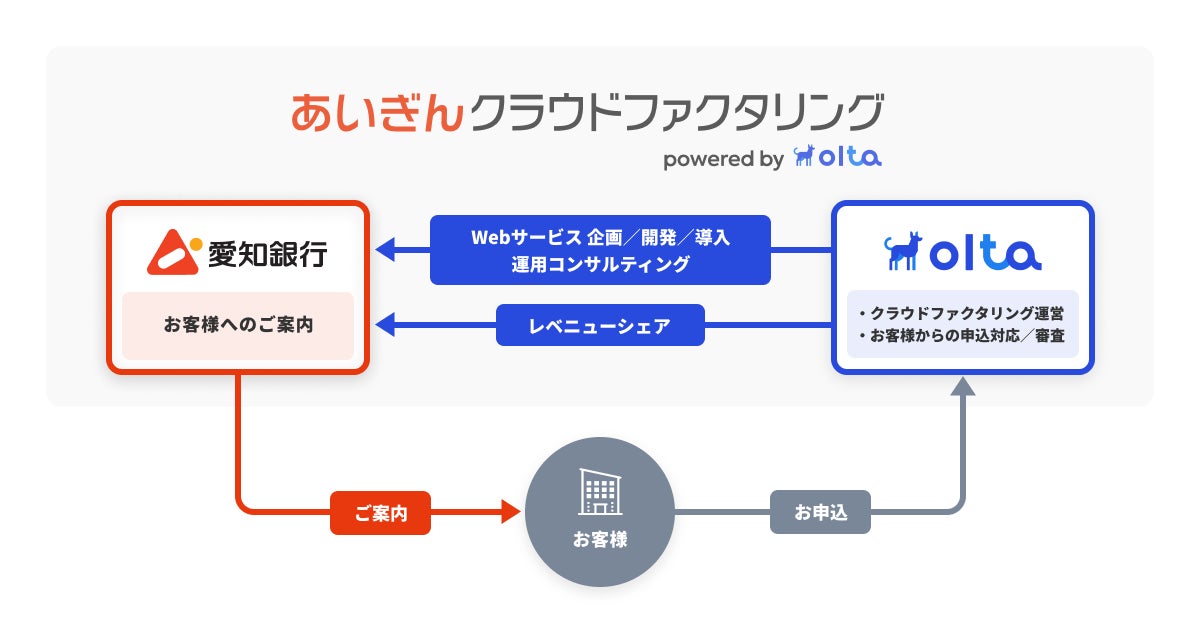OLTAと愛知銀行とのクラウドファクタリング事業における提携では、OLTAがWebサービスの企画・開発・導入および運用におけるコンサルティングを愛知銀行に提供し、愛知銀行は法人・個人事業主のお客様にサービスをご案内します。