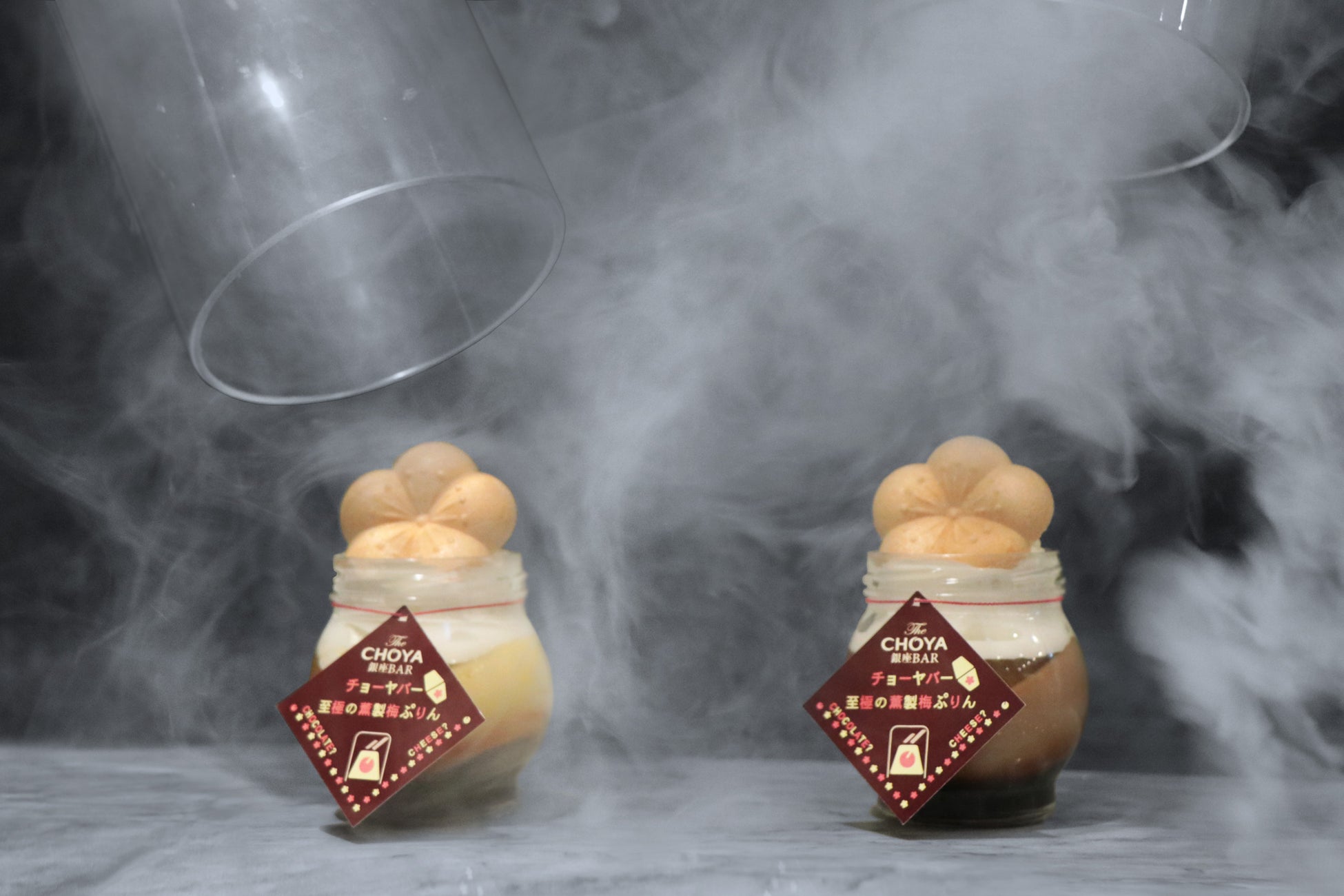 蓋を開けるとガラスドームの中からキレイな4層からなる「チョーヤバー 至極の薫製梅ぷりん」が登場!梅チーズ (写真左) と梅チョコレート (写真右) の2種類からお選びいただけます。梅カラメル、梅チーズまたは梅チョコレートのカスタード層、梅コンフィチュール、梅エスプーマを積み上げ梅最中をトッピング。4層が織り成す贅沢な味わいの本格派梅づくしプリンです。アルコールタイプとノンアルコールタイプをお選びいただけます。