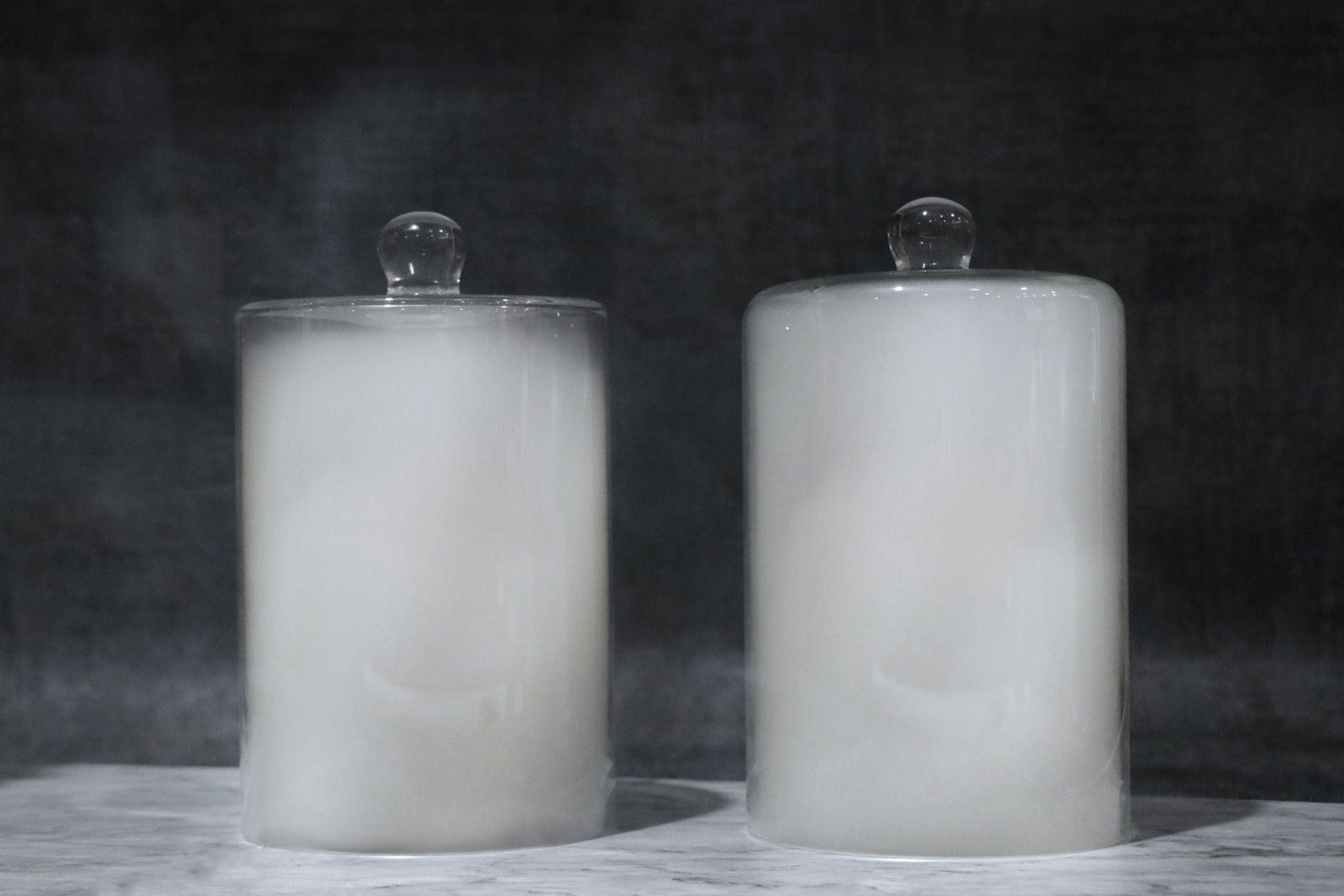 ミクソロジーカクテルで使用するスモーク技術を応用し、梅と同じバラ科の植物である桜の木を使ったチップを焚き、芳ばしい香りの煙をガラスドームに詰め込みました。立ち込める煙で中が見えず、中身があるのか不安になる不思議なデザートです。