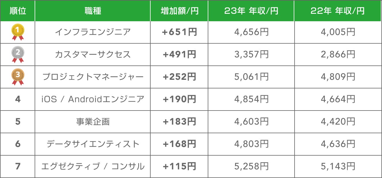 ・カスタマーサクセスは平均年収677万円だが、増加額は99万円で2位