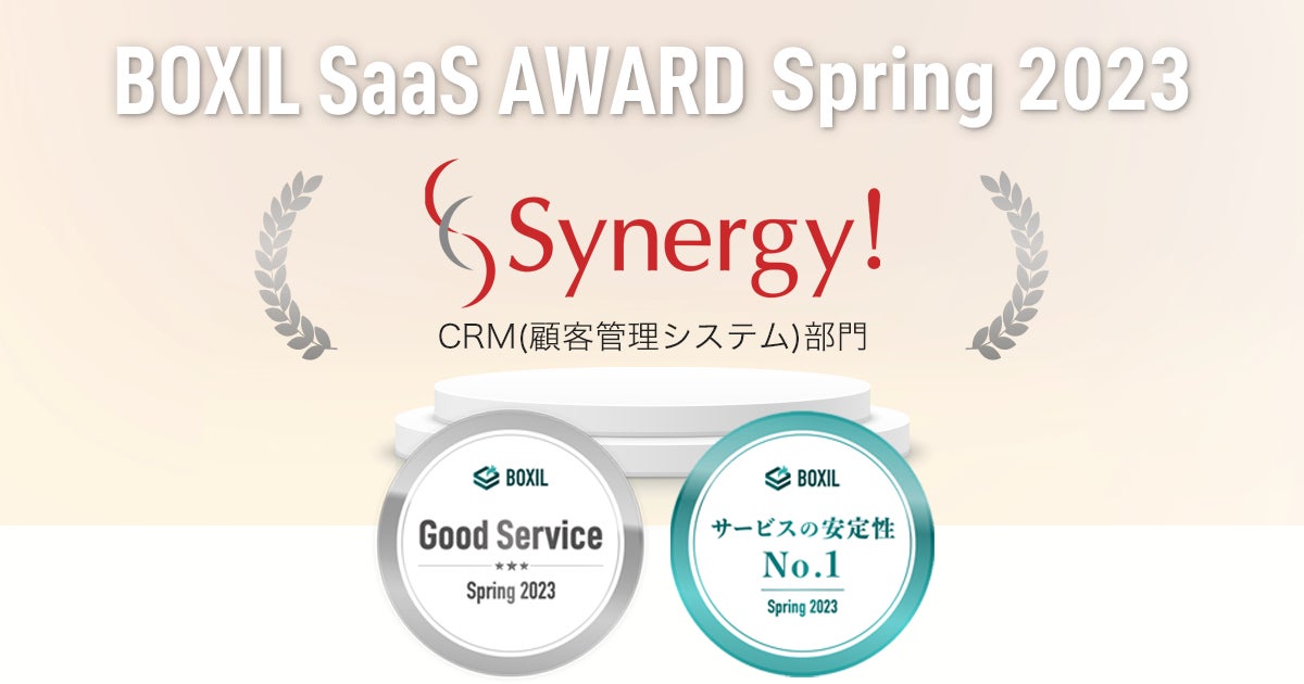 シナジーマーケティング株式会社(所在地:大阪市北区、代表:田代 正雄、以下当社)は、スマートキャンプ株式会社(以下「スマートキャンプ」)が今最も評価されているSaaS(※1)を表彰する「BOXIL SaaS AWARD Spring 2023」で、当社のクラウドCRMシステム「Synergy!(読み方:シナジー)」が前回に引き続き「Good Service」に選出、そして今回は「サービスの安定性No.1」にも選出されたことをお知らせします。