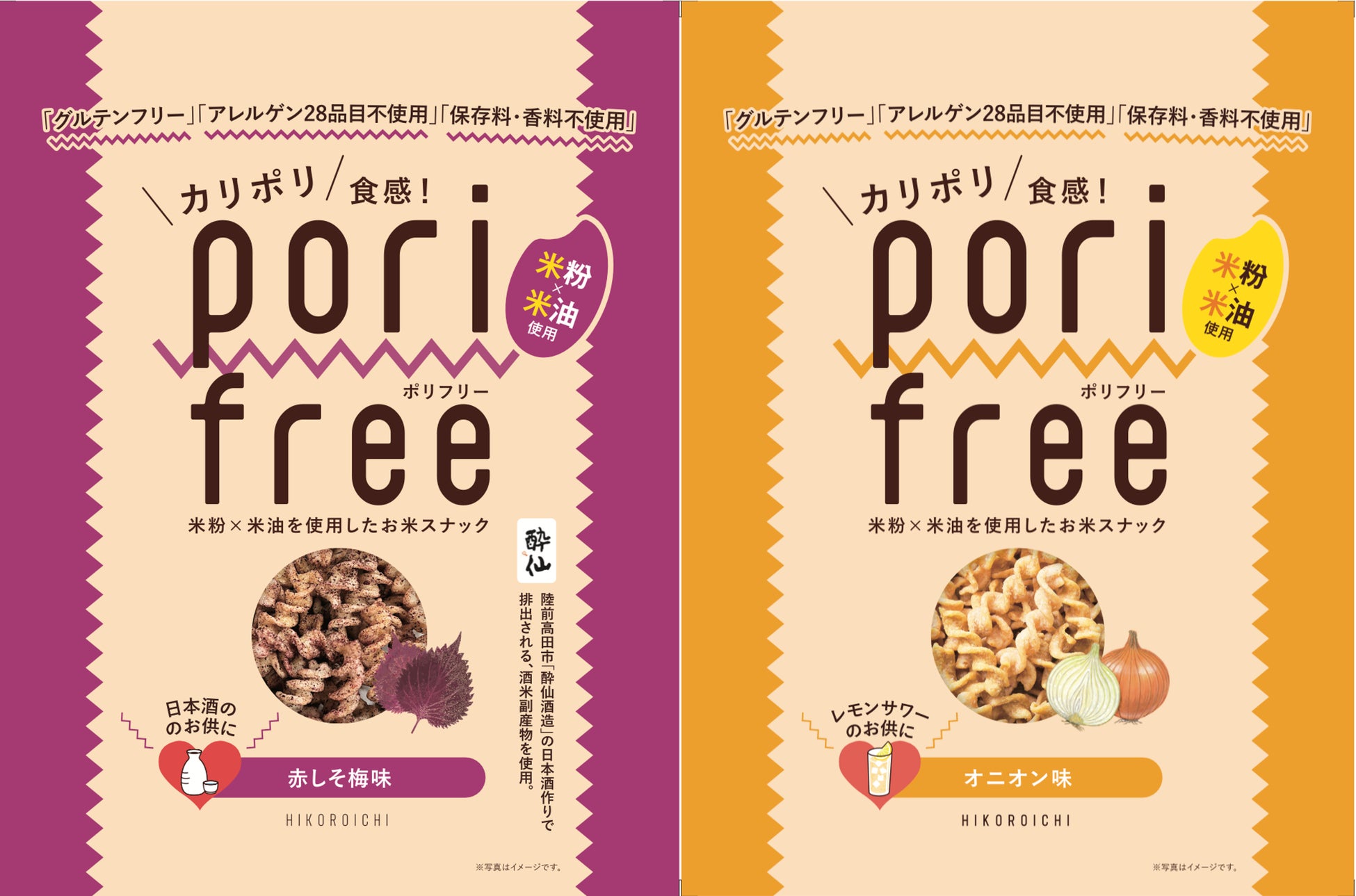 1年半で10万個売り上げたお米のスナック菓子「ポリフリー」シリーズから、「赤しそ梅味」と「オニオン味」が8月31日(野菜の日)に新発売