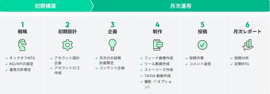 このたび提供開始する本サービスは、活用によって高い集客力とエンゲージメントが期待できるInstagramとTikTokを対象として、戦略策定、コンテンツ制作、データ分析など各領域のプロ人材が複数集まり、最適なプロジェクトチームを編成して運用を担います。
