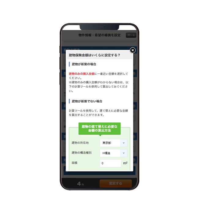 商品の条件を設定する際に、建物の構造選択をサポートする機能や建物評価額の試算をサポートする機能を拡充しました。これによりお客さまは、スムーズに保険比較を進めることができます。