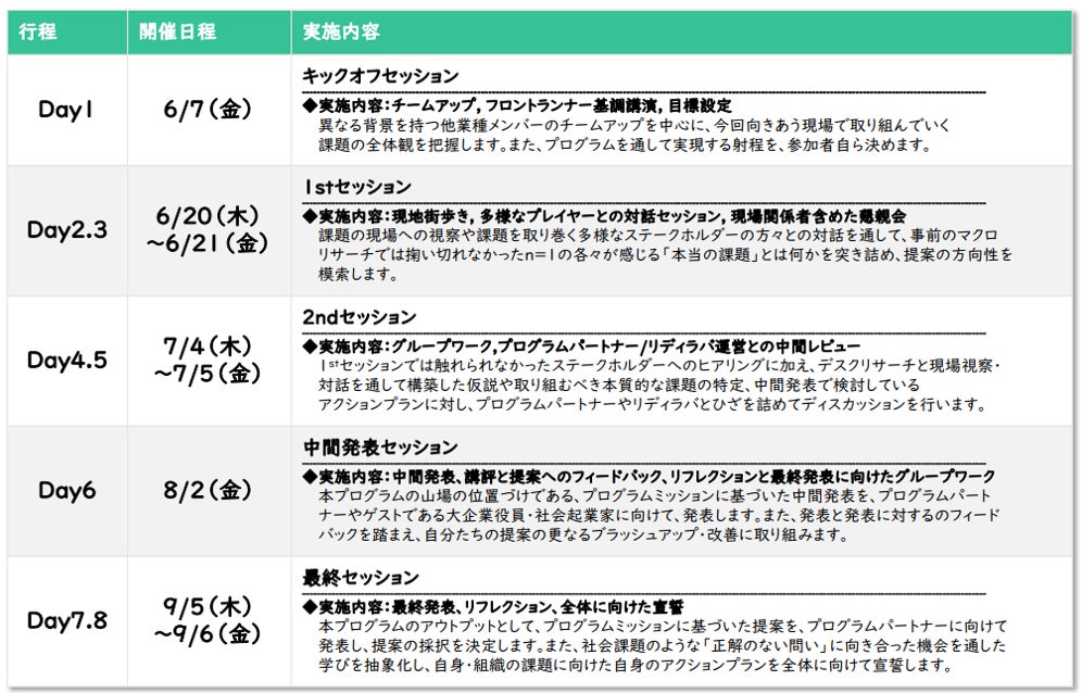 本プログラムは、6月7日(金)から9月6日(金)までの延べ3ヵ月に渡って、計8日間の行程で開催致します。詳細スケジュールは以下に記載しております通りです。