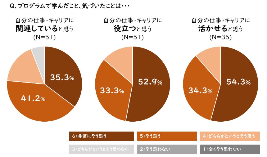 参加者の事後振り返りによると、参加者の約8割が本プログラムでの学び・気付きを現業に接続できることをポジティブに感じている(6:非常にそう思う/5:そう思うを選択)と回答しています。