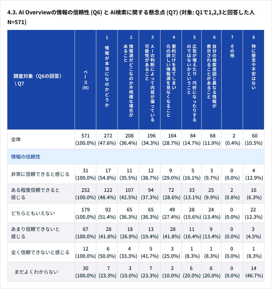 AI Overviewの情報の信頼性 (Q6) と AI検索に関する懸念点 (Q7) (対象: Q1で1,2,3と回答した人 N=571)