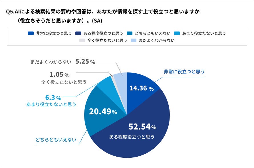 Q5: AIによる検索結果の要約や回答は、あなたが情報を探す上で役立つと思いますか(役立ちそうだと思いますか)。(SA) (対象: Q1で1または2または3と回答した人 N=571)