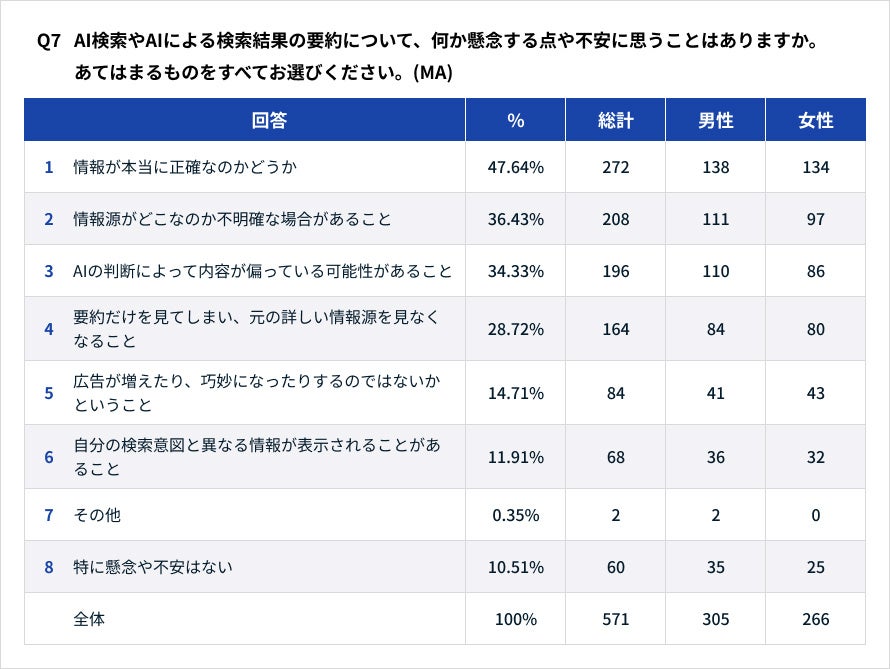 Q7: AI検索やAIによる検索結果の要約について、何か懸念する点や不安に思うことはありますか。(MA) (対象: Q1で1または2または3と回答した人 N=571)