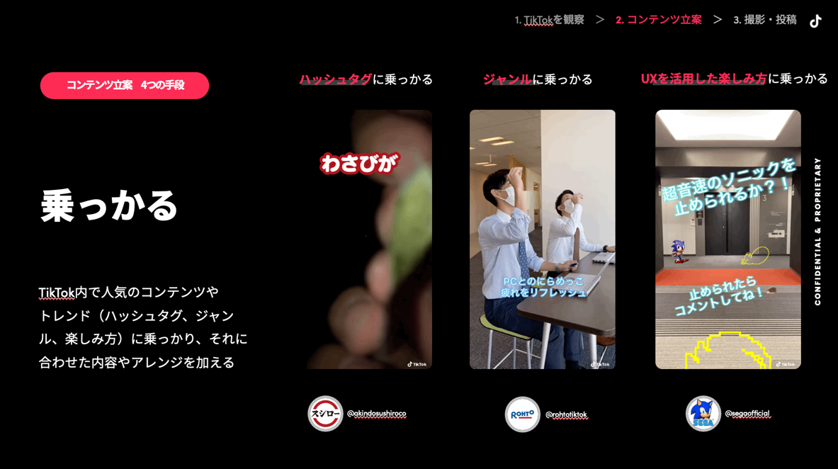 例えば「乗っかる」では、TikTok内で人気のコンテンツやトレンド(ハッシュタグ、ジャンル、楽しみ方)に乗っかり、それに合わせた内容やアレンジを加えるという手段を使うことで、ユーザーからの親近感を醸成します。
