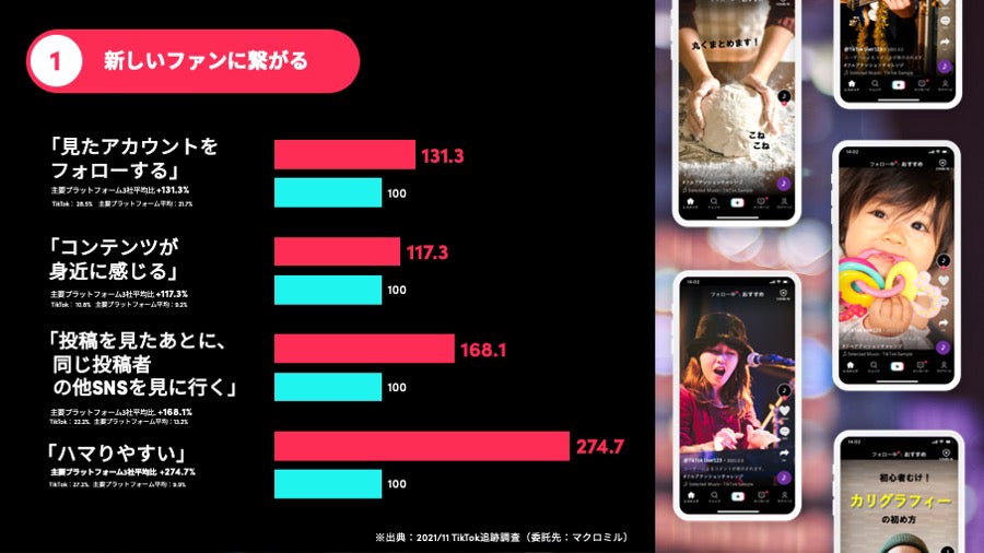 『1. 新しいファンに繋がる』という軸では、「見たアカウントをフォローする」「コンテンツが身近に感じる」「投稿を見た後に、同じ投稿者の他SNSを見に行く」「ハマりやすい」という項目で、TikTokが主要プラットフォーム3社平均より高くなっています。(TikTok追跡調査:2021年11月実施)