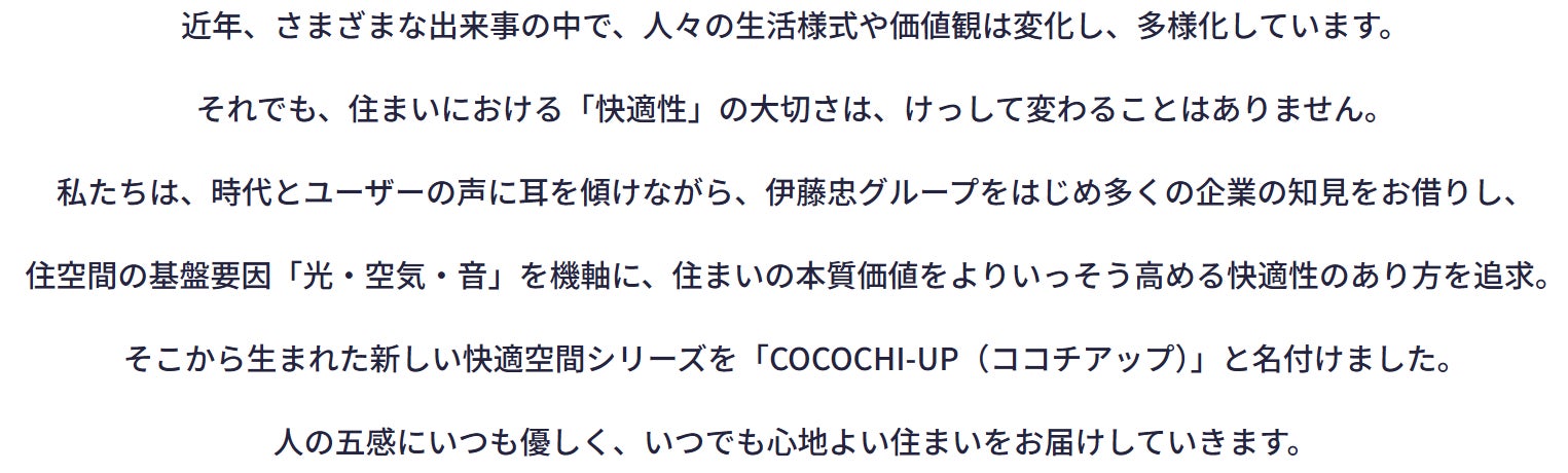 居住環境の基盤となる「光・空気・音」の3つの要素を機軸に、さらなる快適性を高める施策を総称し、「快適空間シリーズ『COCOCHI-UP』」と命名しました。