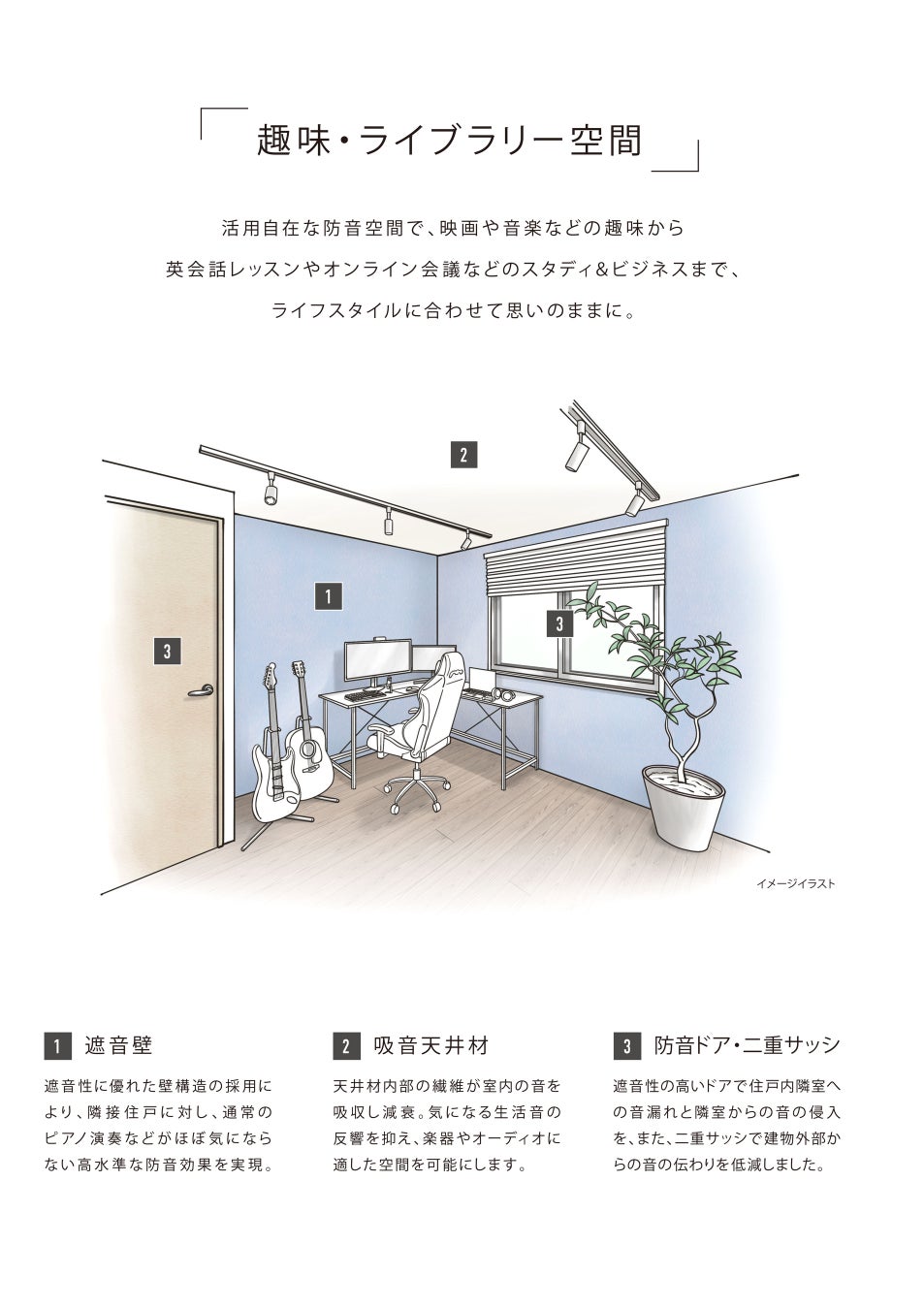 例えば、既に「CREVIA」で採用している快適天井材と調光調色照明や木質の壁・建具を組み合わせた「快眠・リラックスルーム」をはじめ、吸音天井材と遮音壁や防音ドアを組み合わせた「趣味・ライブラリー空間」などを提案していきたいと考えています。