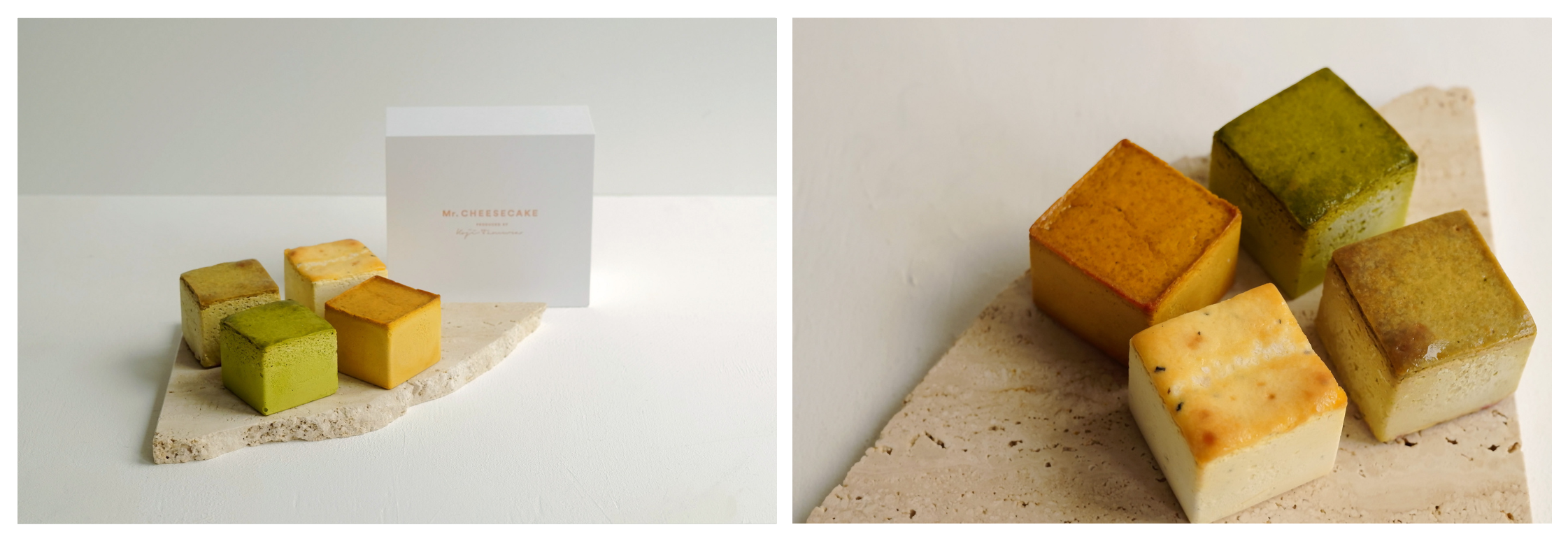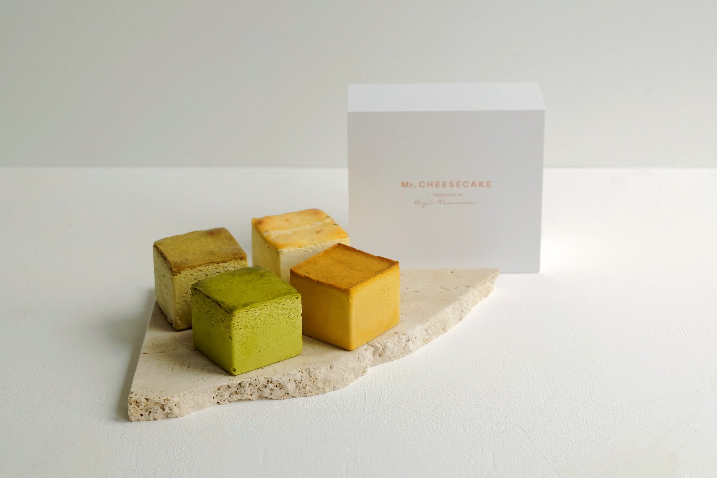 抹茶の香りが引き立つ「Mr. CHEESECAKE Oribe」と、濃厚なピスタチオが主役の「Mr. CHEESECAKE pistachio raspberry」、カボチャと焦がしバターを組み合わせた「Mr. CHEESECAKE Pumpkin Butterscotch」、ヒラミレモン(シークヮーサー)の涼やかな酸味とほのかな苦味を楽しむ「Mr. CHEESECAKE hirami lemon」のアソートセット。食べ比べや大切な人とのシェアにぴったりなキューブ型のケーキ4種をオリジナルのBoxに詰めてお届けします。